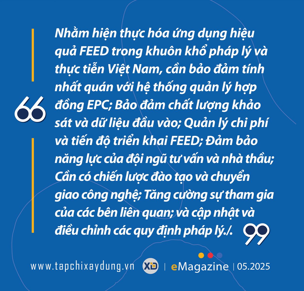 Các khuyến nghị và bài học kinh nghiệm từ các quốc gia như Nhật Bản, Anh và Trung Quốc cũng cần thiết đươc quan tâm để thể chế hóa việc áp dụng FEED đảm bảo các dự án hạ tầng lớn đạt được chất lượng cao và hiệu quả thực tiễn.