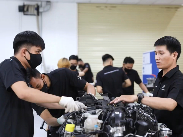 Tại Trung tâm huấn luyện Mercedes-Benz Việt Nam, học viên được thực hành trực tiếp trên các dòng xe C-Class, E-Class, GLC-Class, S-Class, đồng thời được tiếp cận các nội dung đào tạo tiên tiến như chương trình điện áp cao (High Voltage Awareness – High Voltage Qualification Level 1) và kiến thức sản phẩm dành cho các mẫu xe EQ – nền tảng quan trọng giúp họ sẵn sàng với xu hướng điện hóa trong ngành ô tô tương lai. Được biết, tại Việt Nam, Mercedes-Benz Việt Nam là một trong số ít nhà máy sở hữu Trung tâm huấn luyện riêng.