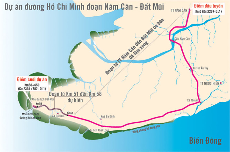 Theo tờ trình, phương án tuyến sẽ bám theo đường Hồ Chí Minh hiện hữu, điểm đầu từ Km0+00 trùng với cọc Km2377 lý trình đường Hồ Chí Minh, trùng lý trình Km2297 QL1A và điểm cuối tại Km58+455 tại vị trí đầu khu vực cột cờ trong khu du lịch Đất Mũi, trong đó giữ nguyên không đầu tư đoạn Km0 - Km4. Dự án có tổng chiều dài tuyến khoảng 58,46km.