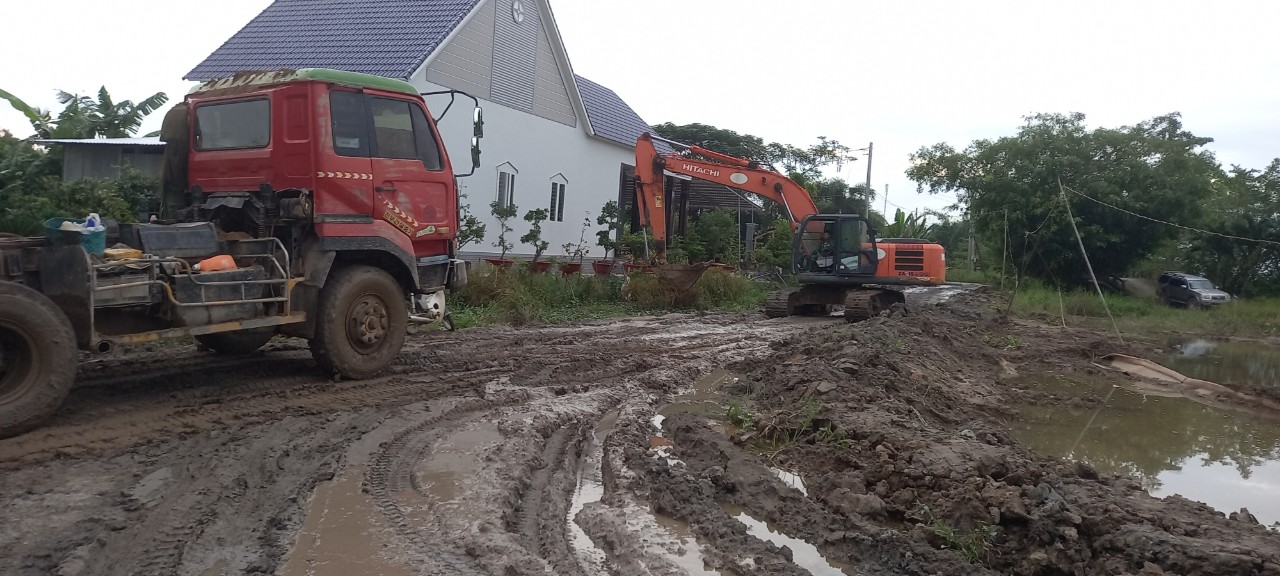 Đường vận chuyển vật liệu để thi công gói thầu XL02 cao tốc Mỹ Thuận - Cần Thơ gặp rất nhiều khó khăn do ngập nước, triều cường và mùa mưa
