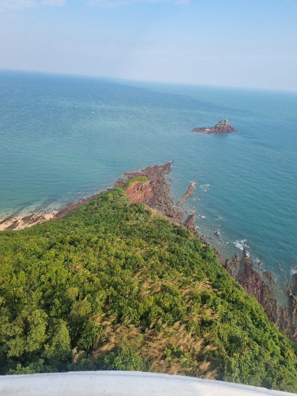 Đi hết khu dân cư, khung cảnh nơi cuối con dốc mở ra bát ngát một bên là vực biển, một bên là vách núi cheo leo. Xa xa trên đỉnh núi Đầu Tán là "mắt biển - hải đăng Vĩnh Thực".