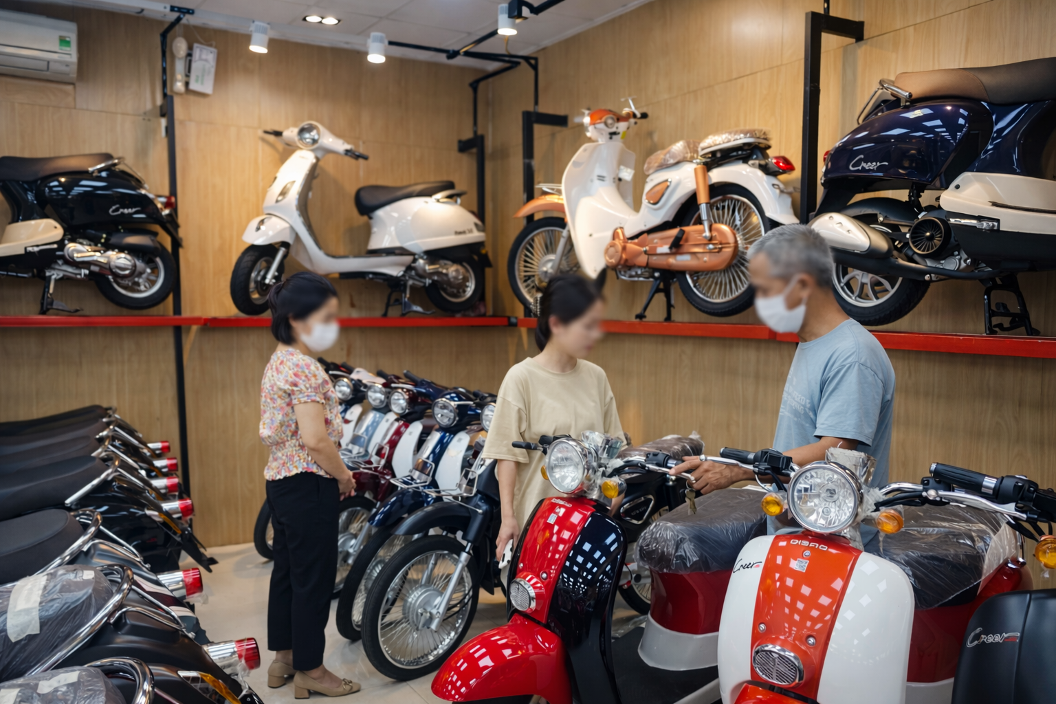 Tìm hiểu một số cửa hàng xe máy điện ở khu vực Cầu Giấy, Hà Nội, tất cả các xe được bán đều nhái kiểu dáng của các dòng xe máy xăng như Vespa, SH. Các dòng xe này được sử dụng 2 loại động cơ chạy bằng pin hoặc ắc quy.