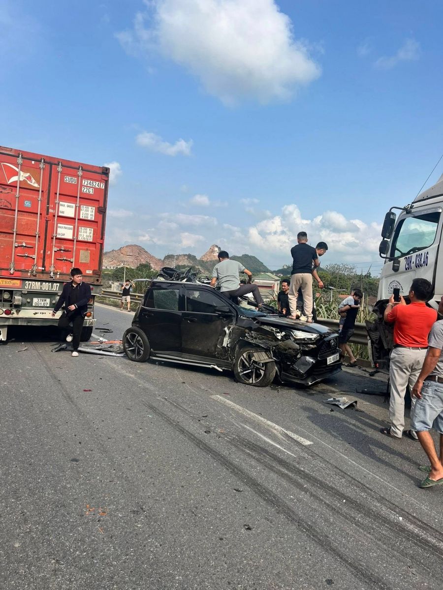 Tại hiện trường, xe còn bị kẹp giữa container và xe tải. Rất may mắn, tài xế xe con đã thoát chết, chỉ bị thương nhẹ.