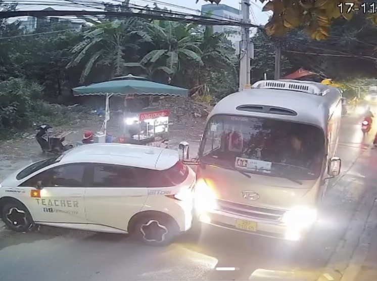 Theo đó, chiếc xe con của thầy giáo dạy lái xe đang được một học viên lùi ra để quay đầu. Tuy nhiên, do học viên này lùi không dứt khoát và sau đó đã va chạm với ô tô khách đang đi thẳng.