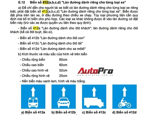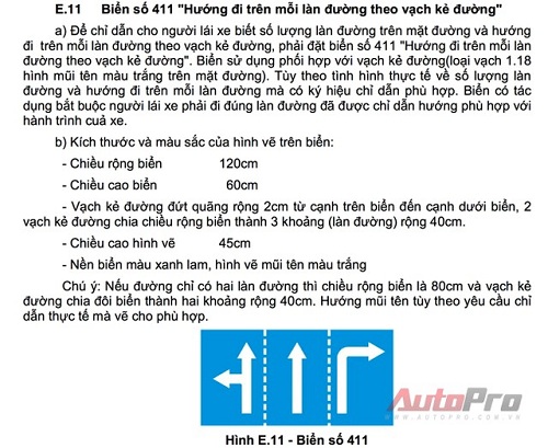 Theo phụ lục E Quy chuẩn kỹ thuật quốc gia về báo hiệu đường bộ (được ban hành theo Thông tư số 17/2012/TT-BGTVT ngày 29/05/2012 của Bộ trưởng Bộ GTVT) thì biển báo màu xanh 411 có ý nghĩa: “chỉ dẫn cho người lái xe biết số lượng làn đường trên mặt đường và hướng đi trên mỗi làn đường theo vạch kẻ đường” và “Biển có tác dụng bắt buộc người lái xe phải đi đúng làn đường đã được chỉ dẫn hướng phù hợp với hành trình cuả xe”.