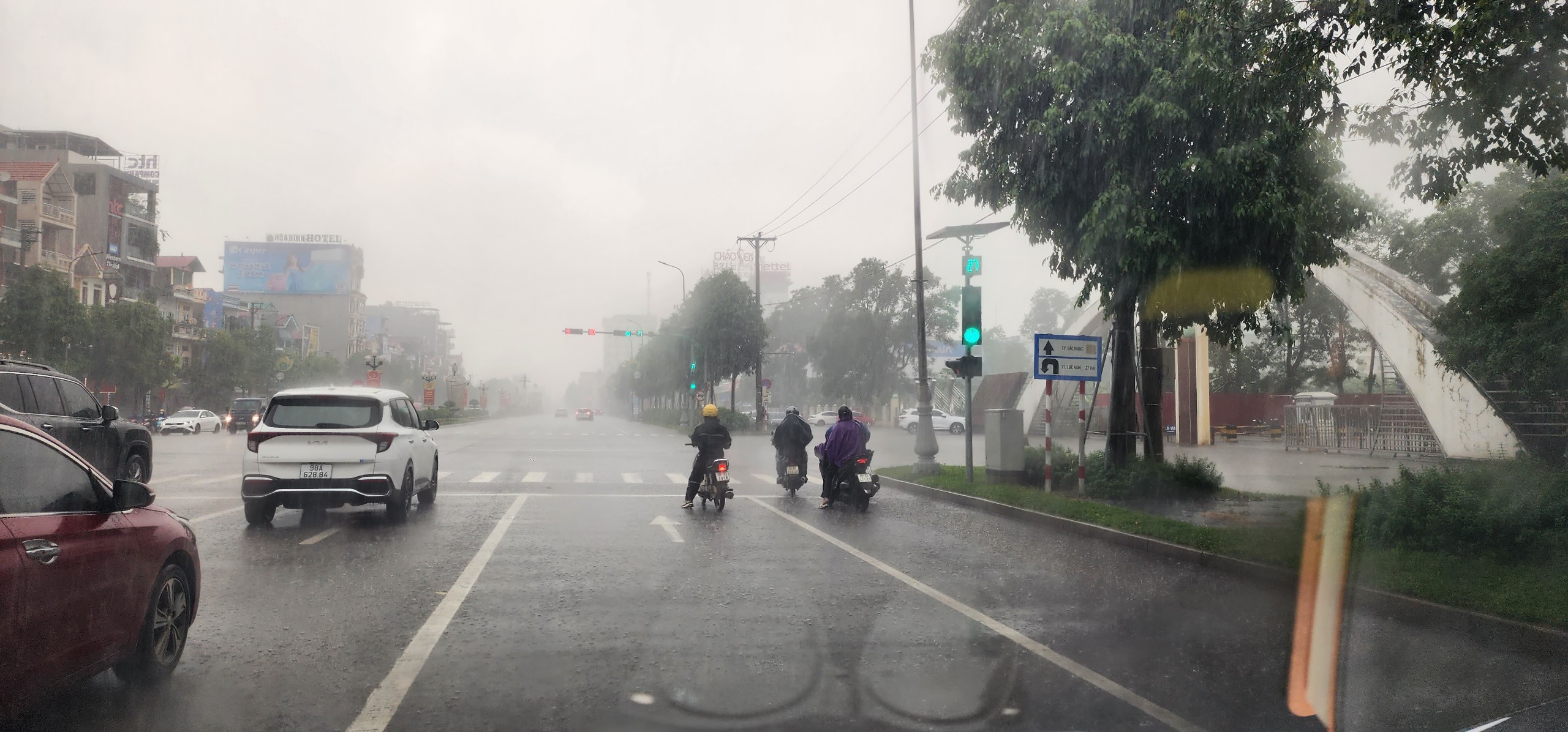 14h35 ngày 9/5, TP. Bắc Giang có mưa rất to. Lưu thông trên đường Xương Giang, dù rất thoáng, không có cảnh sát giao thông, trời thì mưa to nhưng người điều khiển xe máy BKS 98K2 – 918.xx. vẫn nghiêm chỉnh chấp hành dừng trước vạch kẻ đường khi đèn đỏ đang bật sáng.