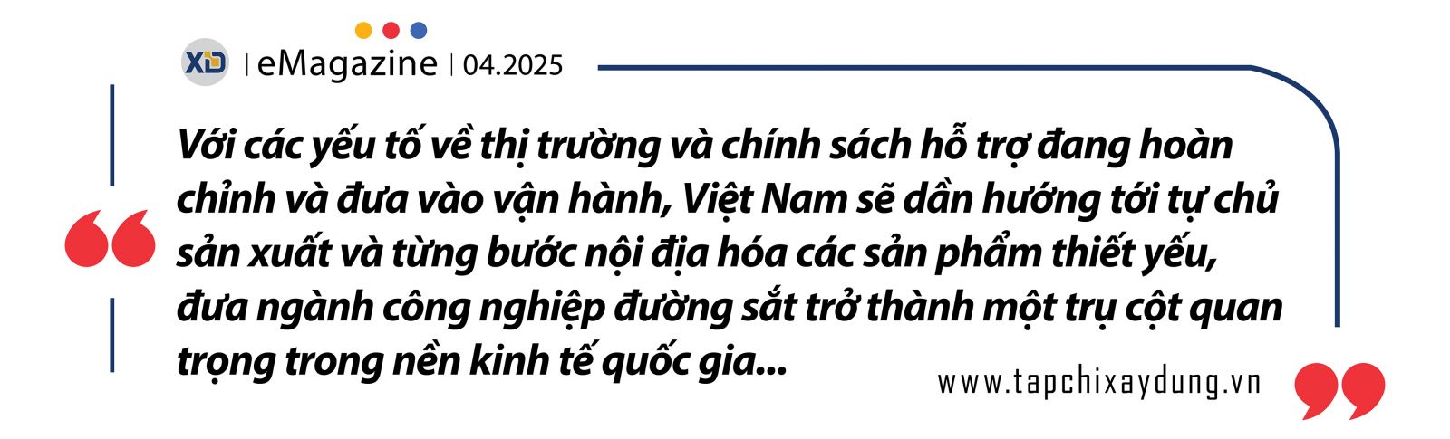 Với các yếu tố về thị trường và chính sách hỗ trợ đang hoàn chỉnh và đưa vào vận hành, Việt Nam hoàn toàn có khả năng làm chủ công nghiệp xây dựng hạ tầng đường sắt, dần hướng tới tự chủ sản xuất và từng bước nội địa hóa các sản phẩm thiết yếu, đưa ngành công nghiệp đường sắt trở thành một trụ cột quan trọng trong nền kinh tế quốc gia...