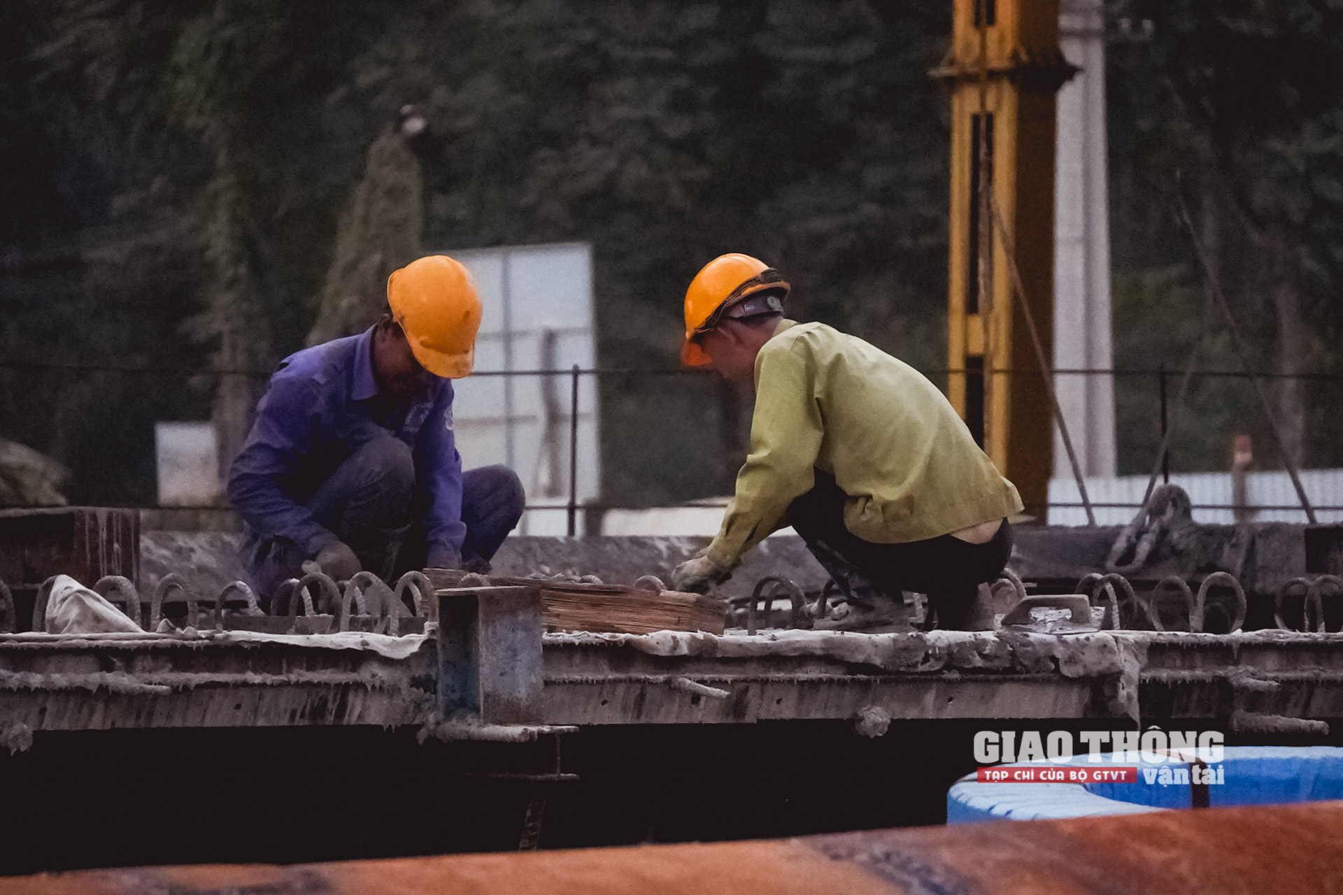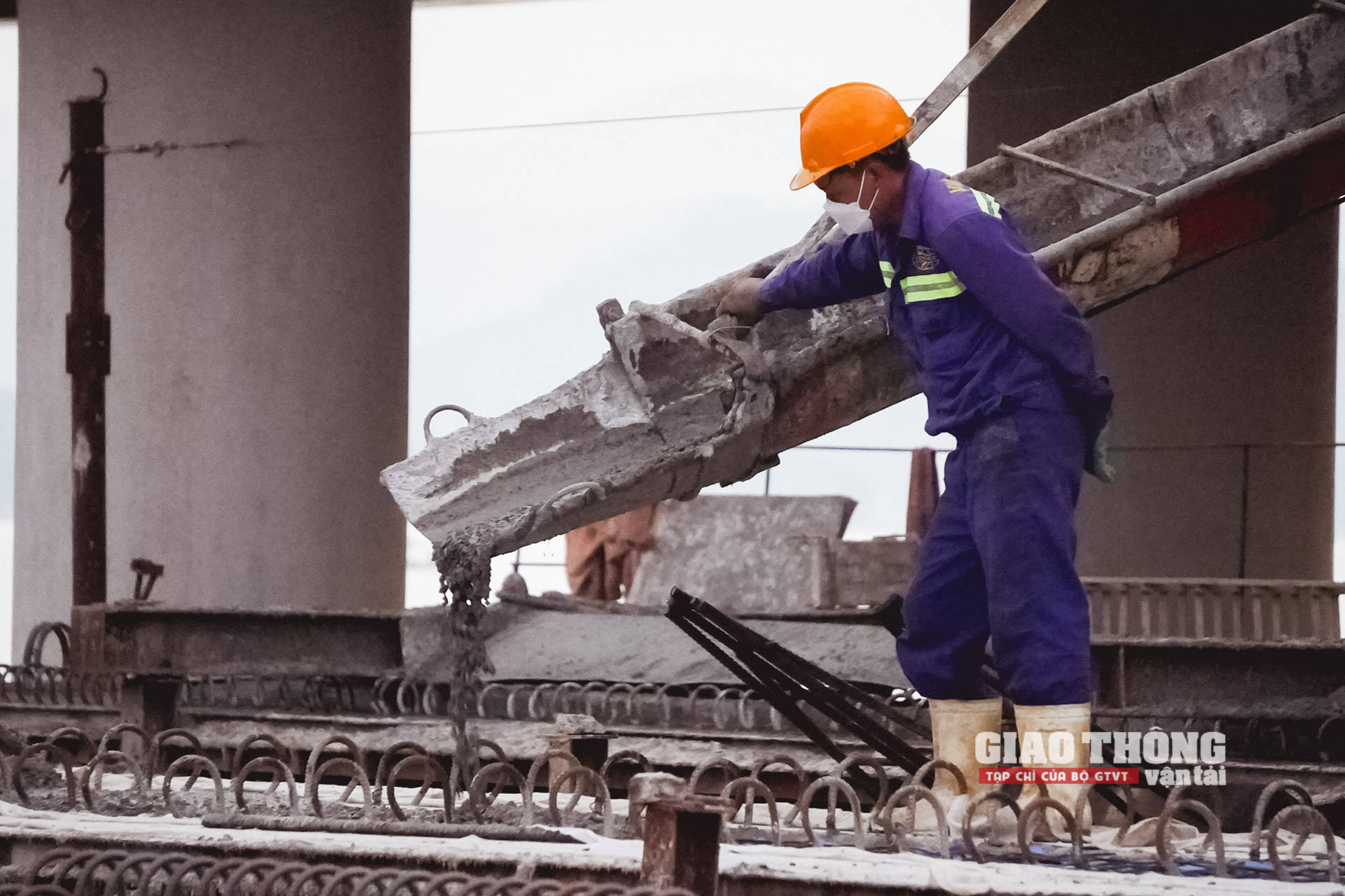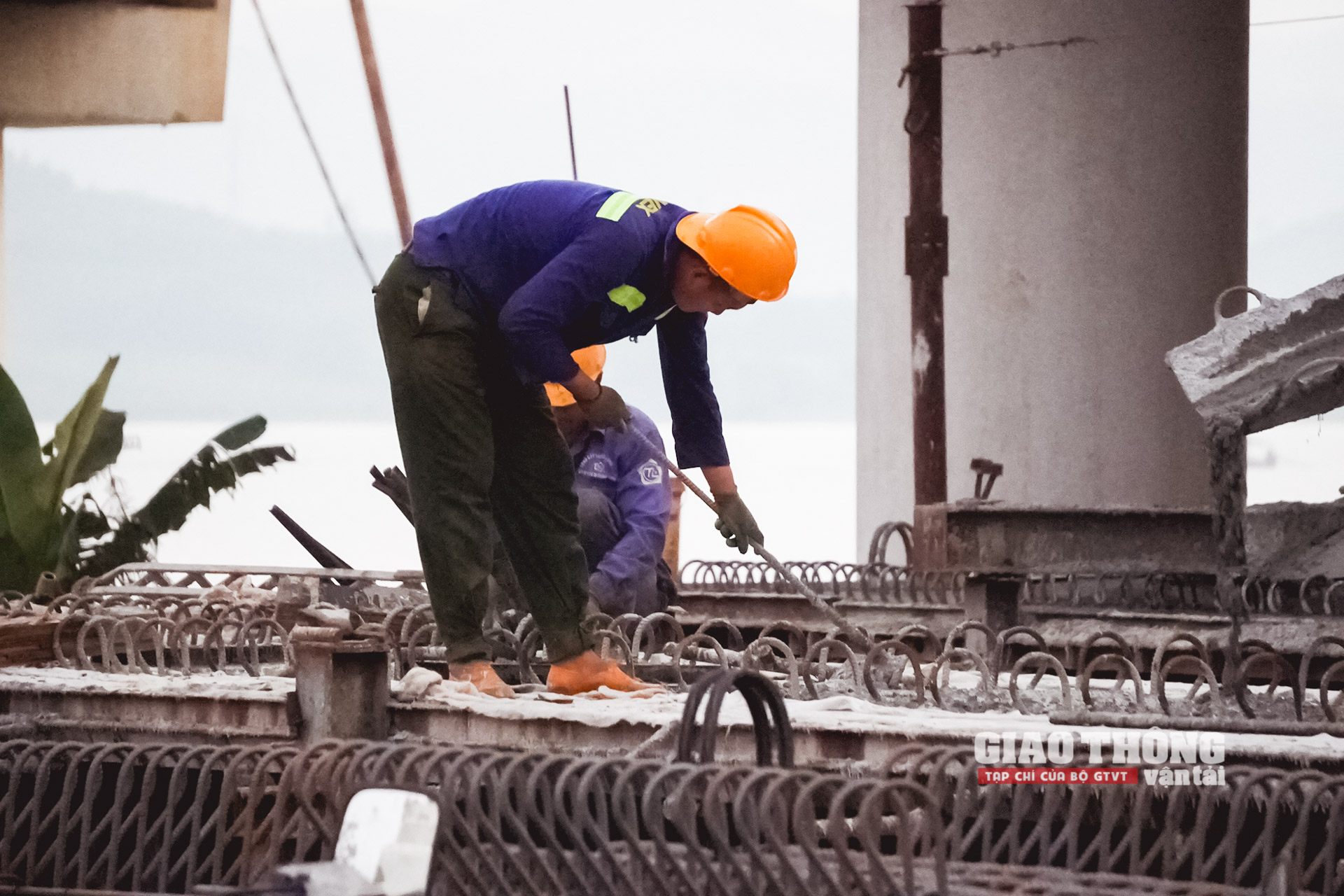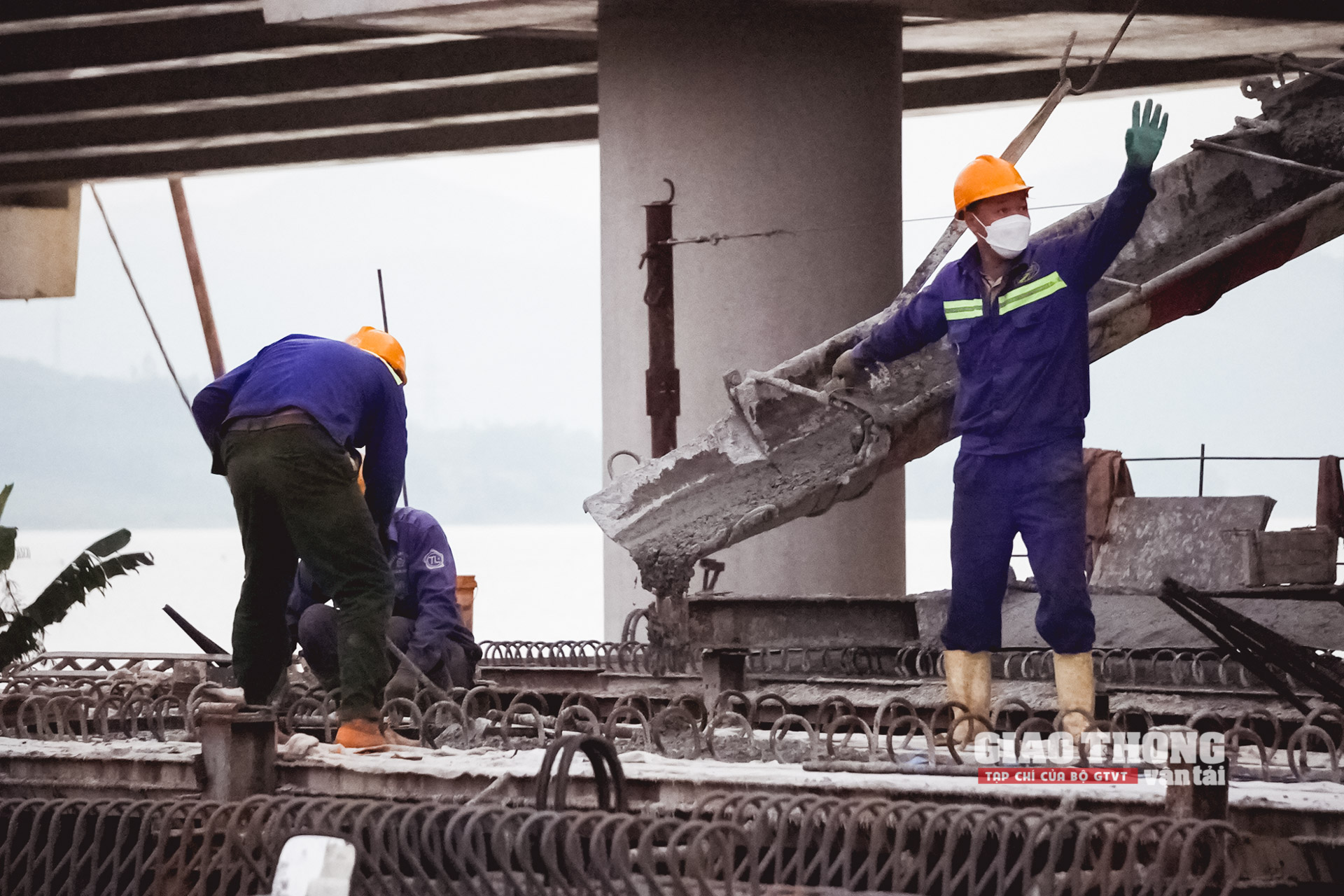 Công nhân nhà thầu VINACONEX với đầy đủ trang thiết bị bảo hộ khi thi công cầu vượt hồ Yên Mỹ