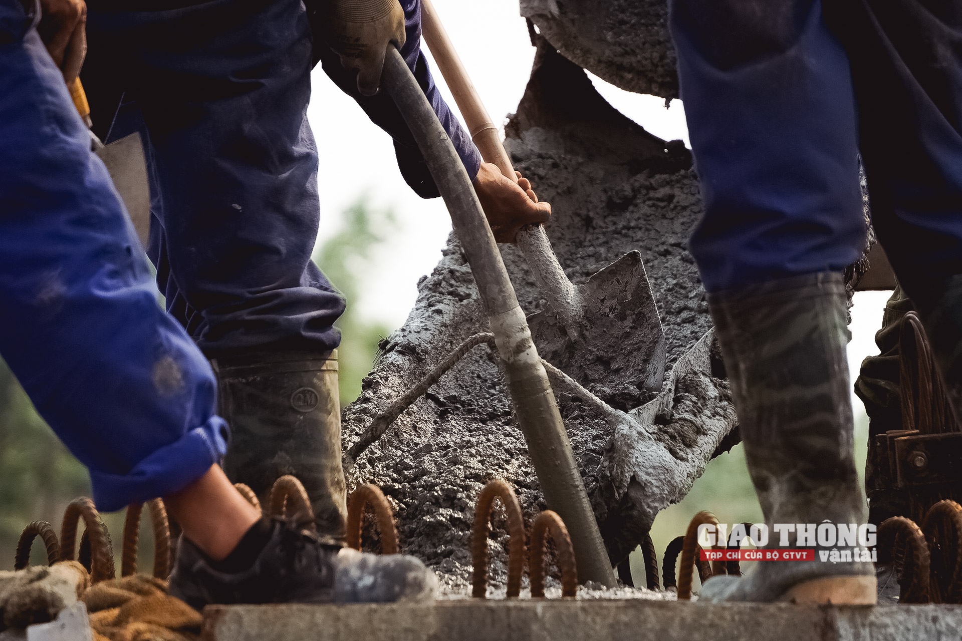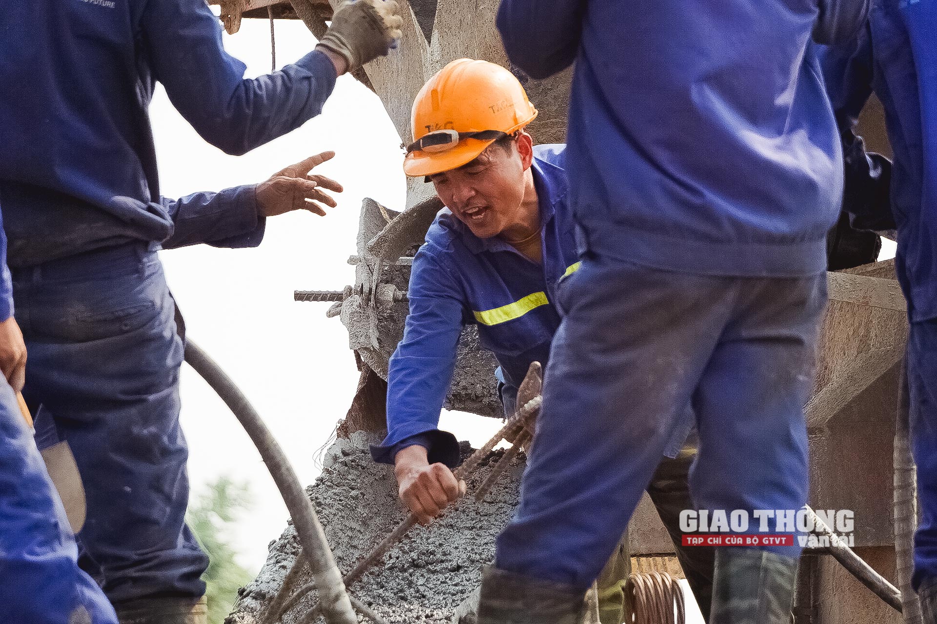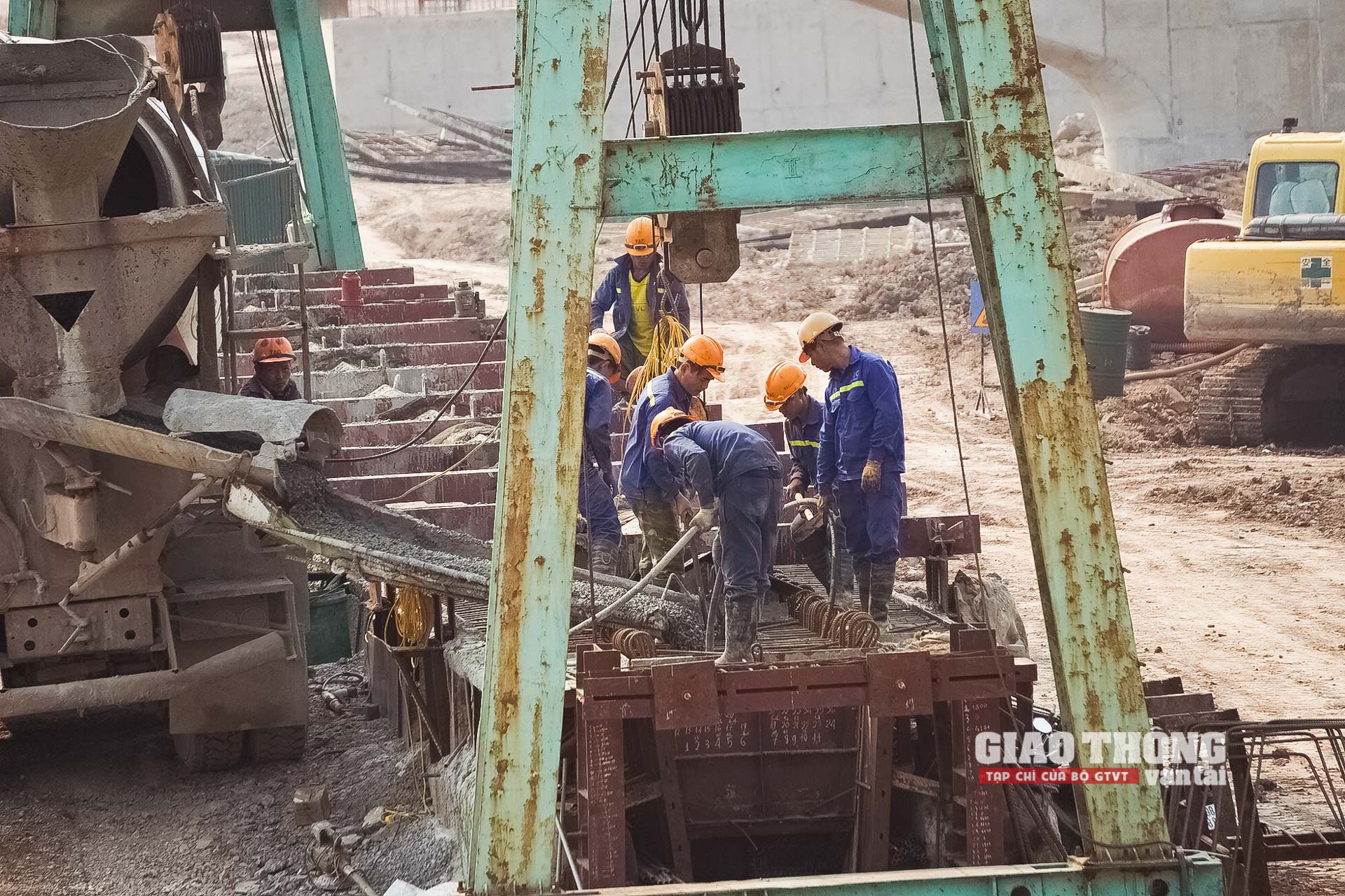 Những mẻ bê tông vừa được trộn xong liên tục được nhồi xuống để thi công các trụ tháp