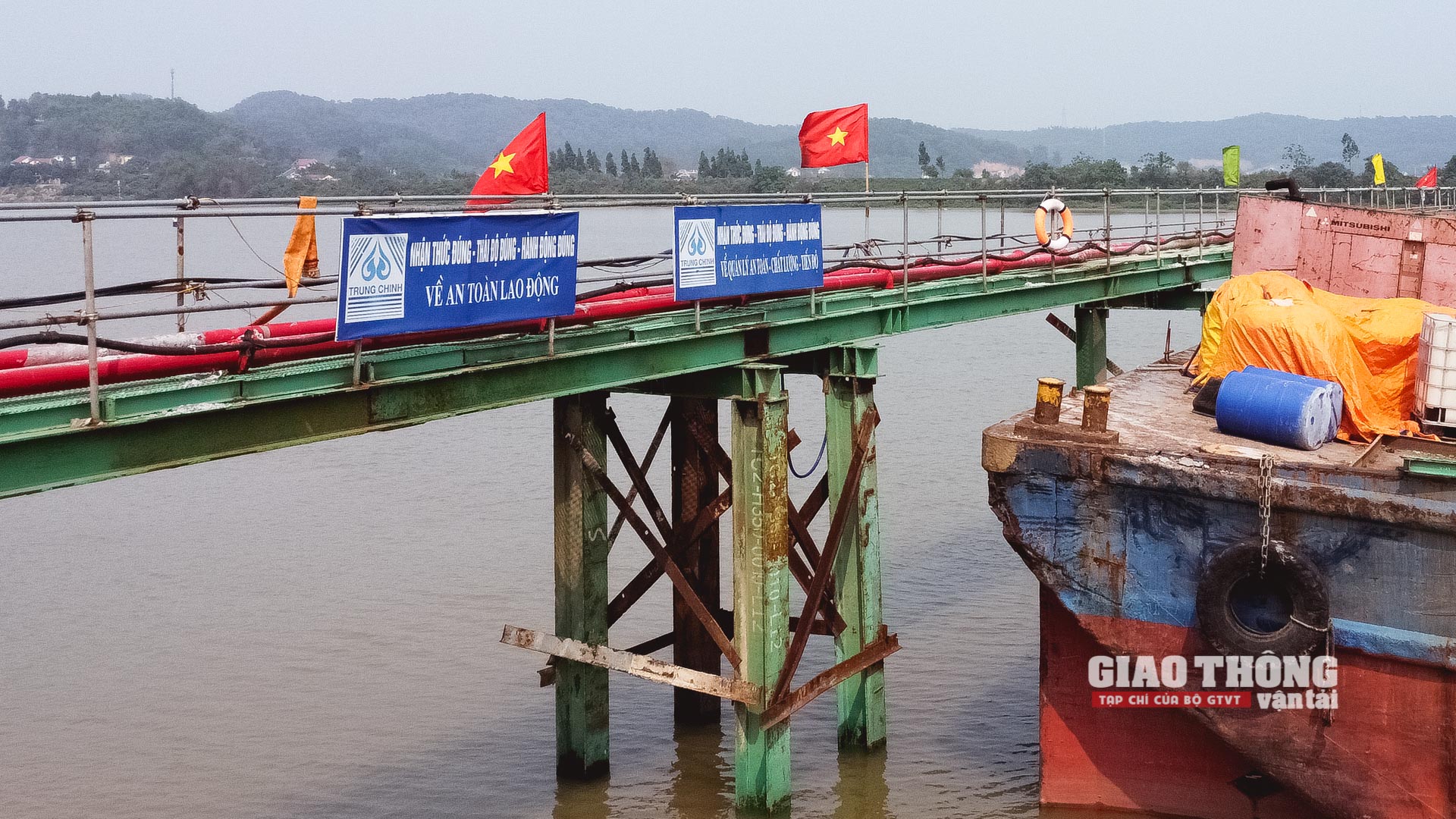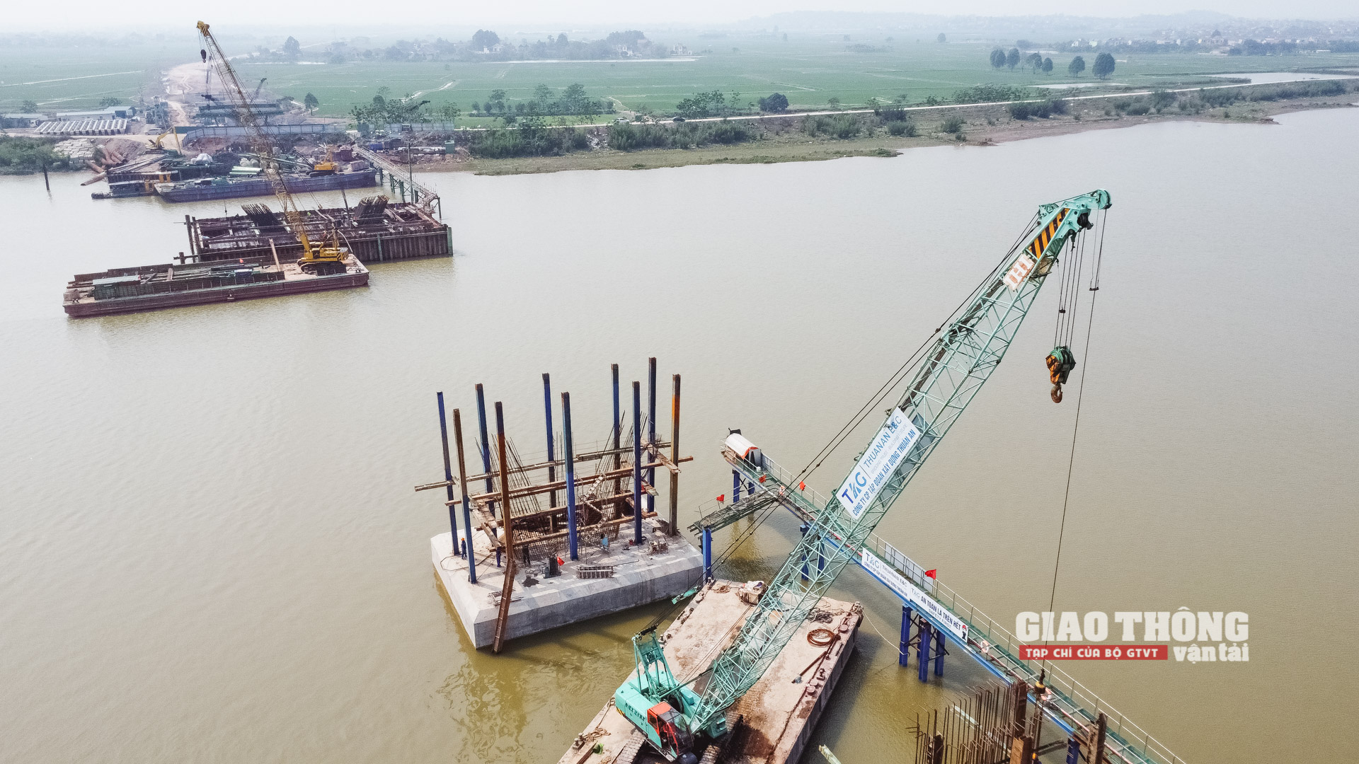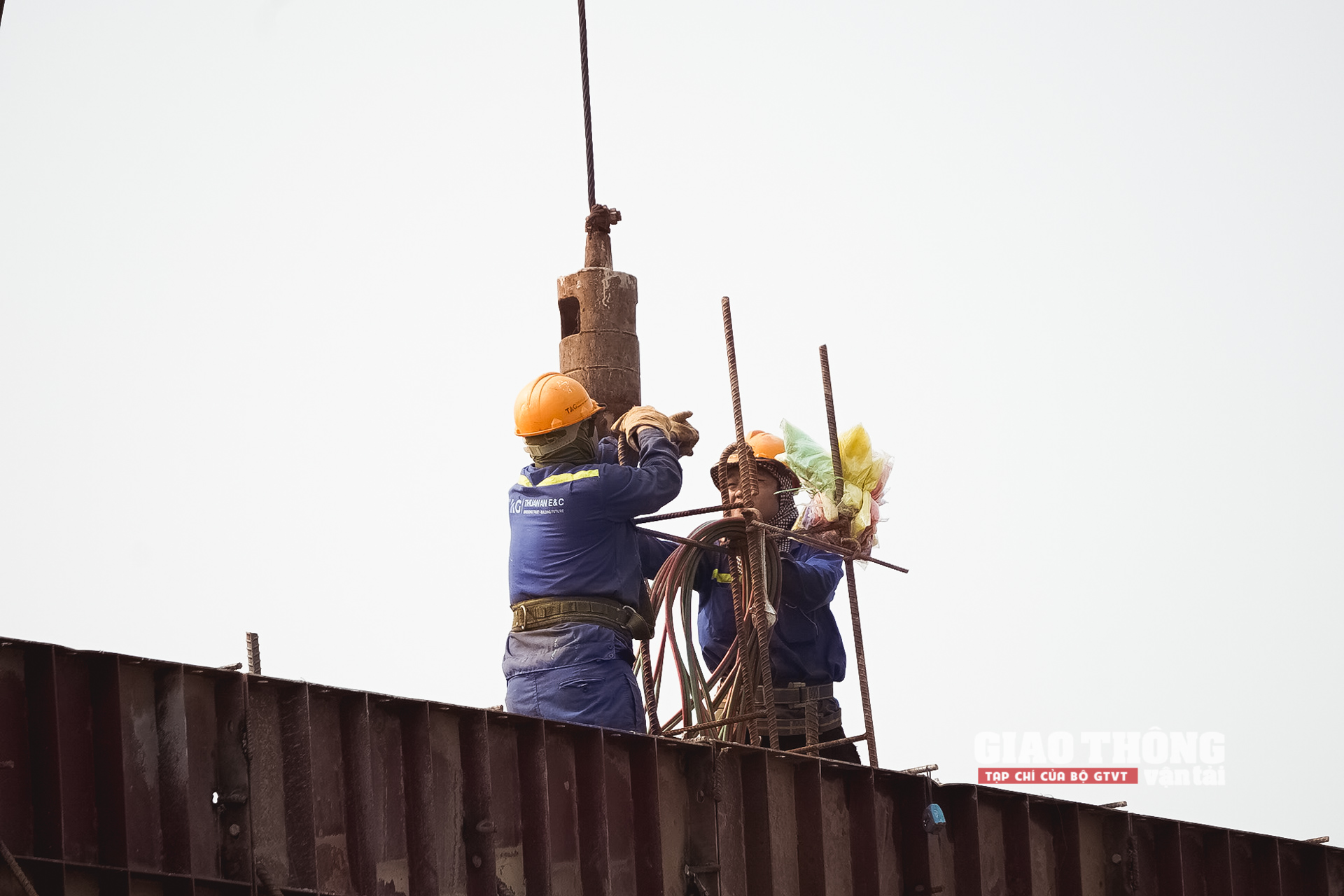 Để thi công các trụ tháp giữa sông, các nhà thầu sử dụng hệ thống cầu công vụ, xà lan tiếp cận công trường. Đồng thời, công tác đảm bảo an toàn lao động trong quá trình thi công cũng được thực hiện rất nghiêm ngặt, bài bản.