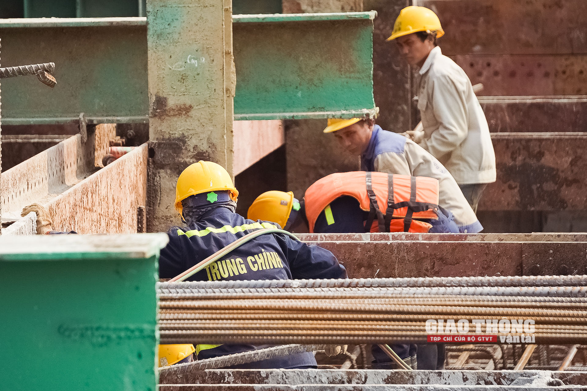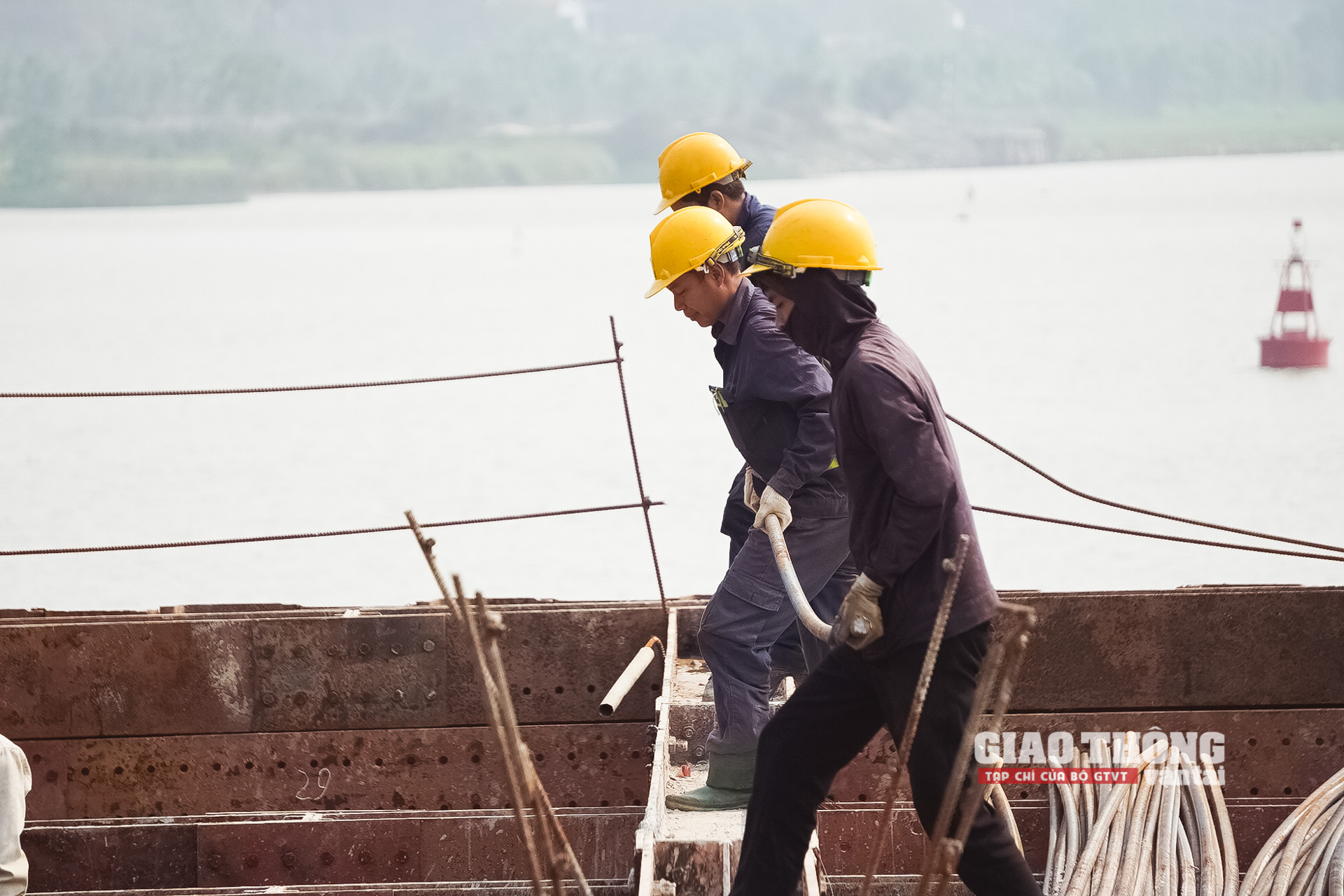 Ở các trụ tháp giữa sông, không khí thi công luôn diễn ra khẩn trương