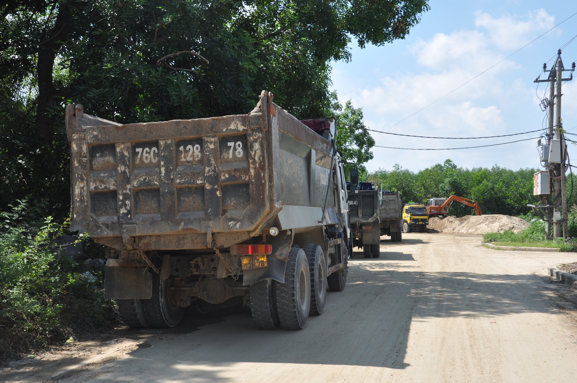 Người dân địa phương phản ánh, xe chở cát sỏi chạy liên tục trong ngày, từ sáng sớm đến tối khuya, nhưng tập trung nhiều nhất vào thời điểm giữa trưa và đêm tối, từ 19h-24h. Ban ngày thì xe chở cát từ các bãi tập kết trong khu vực cụm công nghiệp-làng nghề Tịnh Ấn Tây đưa đi tiêu thụ. Còn ban đêm, cát được xe ben rầm rập chở từ khu vực sông Trà Khúc vào cất giấu ở bãi tập kết.