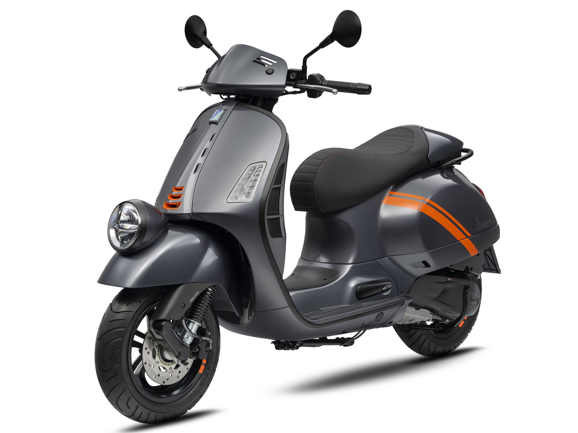 Vespa GTV 2023 phối màu hài hòa Be bóng Sabbia với Xám bóng Titanio cùng bộ tem sọc cam chéo bên hông. Diện mạo tổng thể nổi bật hơn nữa với các chi tiết sơn đen nhám đặc trưng chạy dọc khung thân xe, viền đèn pha thấp đến cụm đèn hậu, tay dắt, gác chân, ốp ống xả, gương chiếu hậu, khung đỡ và khung bảng đồng hồ.