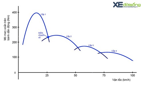 Sự biến đổi mô men xoắn trên các bánh dẫn động trong quá trình tăng tốc của một loại xe sử dụng hộp số 4 cấp.