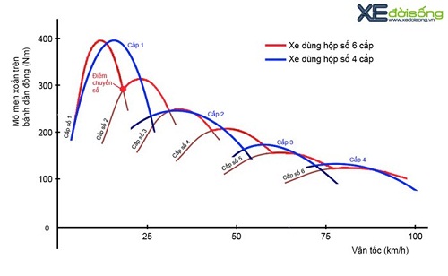 So sánh hai loại hộp số này có thể thấy sự biến thiên mô men xoắn trên bánh dẫn động của xe sử dụng hộp số nhiều cấp thường ít hơn xe có hộp số ít cấp.