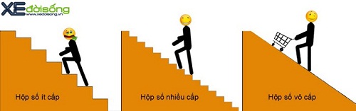 Xét về nhiều mặt, thì hộp số ít cấp và hộp số nhiều cấp cũng giống như hai người leo lên cầu thang có độ dốc như nhau, nhưng các bậc thang có độ cao khác nhau, một cái có bậc thang nhỏ nhưng nhiều bậc còn một cái ít bậc thang nhưng độ cao mỗi bậc lại lớn. Người leo cầu thang có bậc thang nhỏ phải bước nhiều bước hơn, nhưng mỗi bước nhỏ hơn, ít phải vận sức cho từng bước, dao động của thân người khi leo nhỏ hơn và sức rải ra đều hơn. Còn hộp số vô cấp lại giống như một cái dốc trơn có thể đẩy được xe lăn.