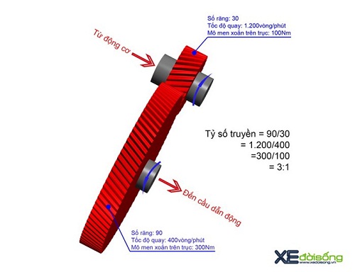 Theo đó, mô men xoắn từ động cơ được truyền đến hộp số, thông qua cặp bánh răng này thì tốc độ quay và mô men xoắn trên trục ra được biến đổi tương ứng với tỷ số truyền do sự sai khác về số răng. Khi nguồn mô men xoắn này được truyền đến bánh dẫn động thì mô men xoắn và tốc độ quay của bánh dẫn động cũng biến đổi tương ứng với tỷ số truyền của hệ thống truyền động bánh răng này.