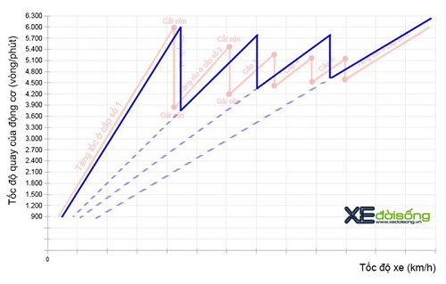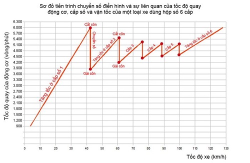 Tiến trình chuyển số của một mẫu xe số sàn 6 cấp điển hình trong điều kiện tăng tốc nhanh tối đa với thao tác chuyển số hoàn hảo được mô tả như hình dưới. Ở đây cho thấy sự liên quan giữa tốc độ quay của động cơ và tốc độ xe ứng với các cấp số khác nhau. Các tay đua F1 thường được đào tạo rất kỹ về tiến trình chuyển số lý tưởng của chiếc xe mà họ điều khiển, để quyết định ở ngưỡng tốc độ quay nào của động cơ và vận tốc xe bao nhiêu thì cần chuyển số, nhằm tăng tốc nhanh nhất có thể.