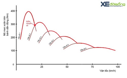 Trong tiến trình này, mô men xoắn trên bánh dẫn động sẽ thay đổi giảm dần theo từng cấp số. Đây thực chất là sự ghép nối của nhiều đồ thị mô men xoắn ở các cấp số khác nhau. Với xe có hộp số tự động 6 cấp thì đồ thị mô men xoắn trên bánh dẫn động chính là 6 đồ thị mô men xoắn ở 6 cấp số khác nhau. Tại cấp số càng thấp thì mô men xoắn trên bánh dẫn động càng cao, tuy nhiên, xe không thể đạt tốc độ cao ở các cấp số thấp này. Khi chuyển sang các cấp số cao hơn, mô men xoắn trên các bánh dẫn động giảm nhưng tốc độ tăng lên.