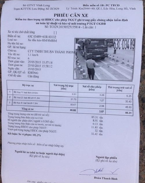 Kết quả cân xe cho thấy, xe chở quá tải trên hơn 101% trọng lượng hàng hóa cho phép chuyên chở. Phía Thanh tra giao thông Vĩnh Long cho biết tổng xác xe trên 20,7 tấn và hàng hóa được chở chỉ 32 tấn và tổng cộng xe này là 53 tấn nhưng ghi nhận khi cân cho thấy tổng trọng lượng xe lên đến trên 85,3 tấn.