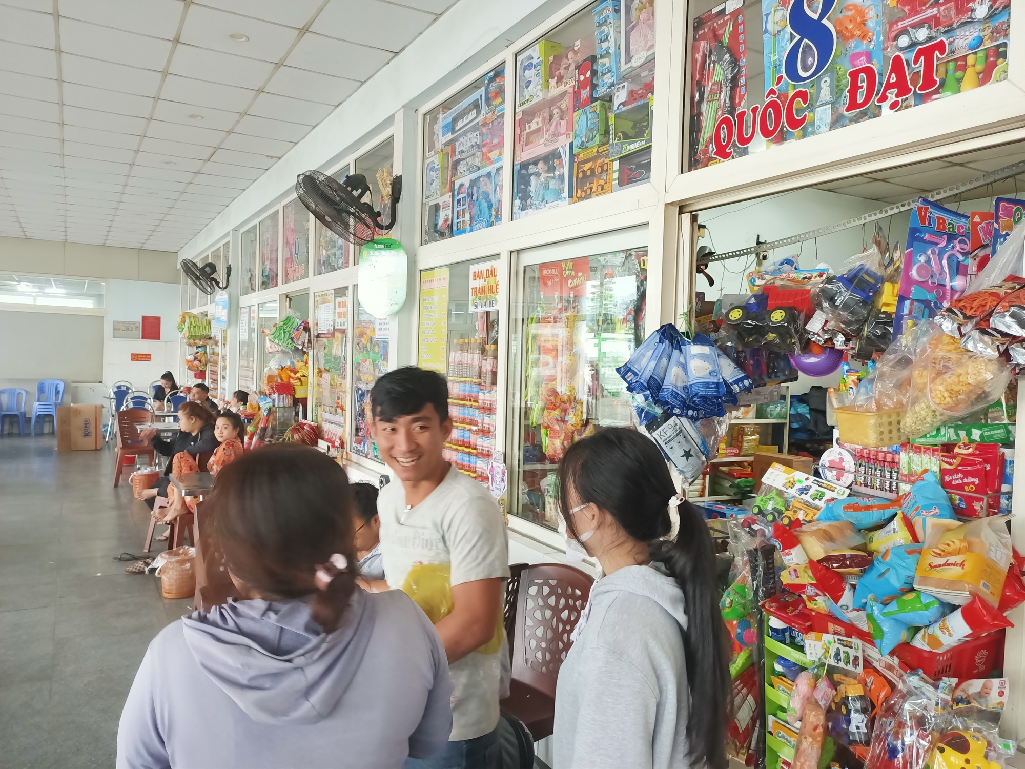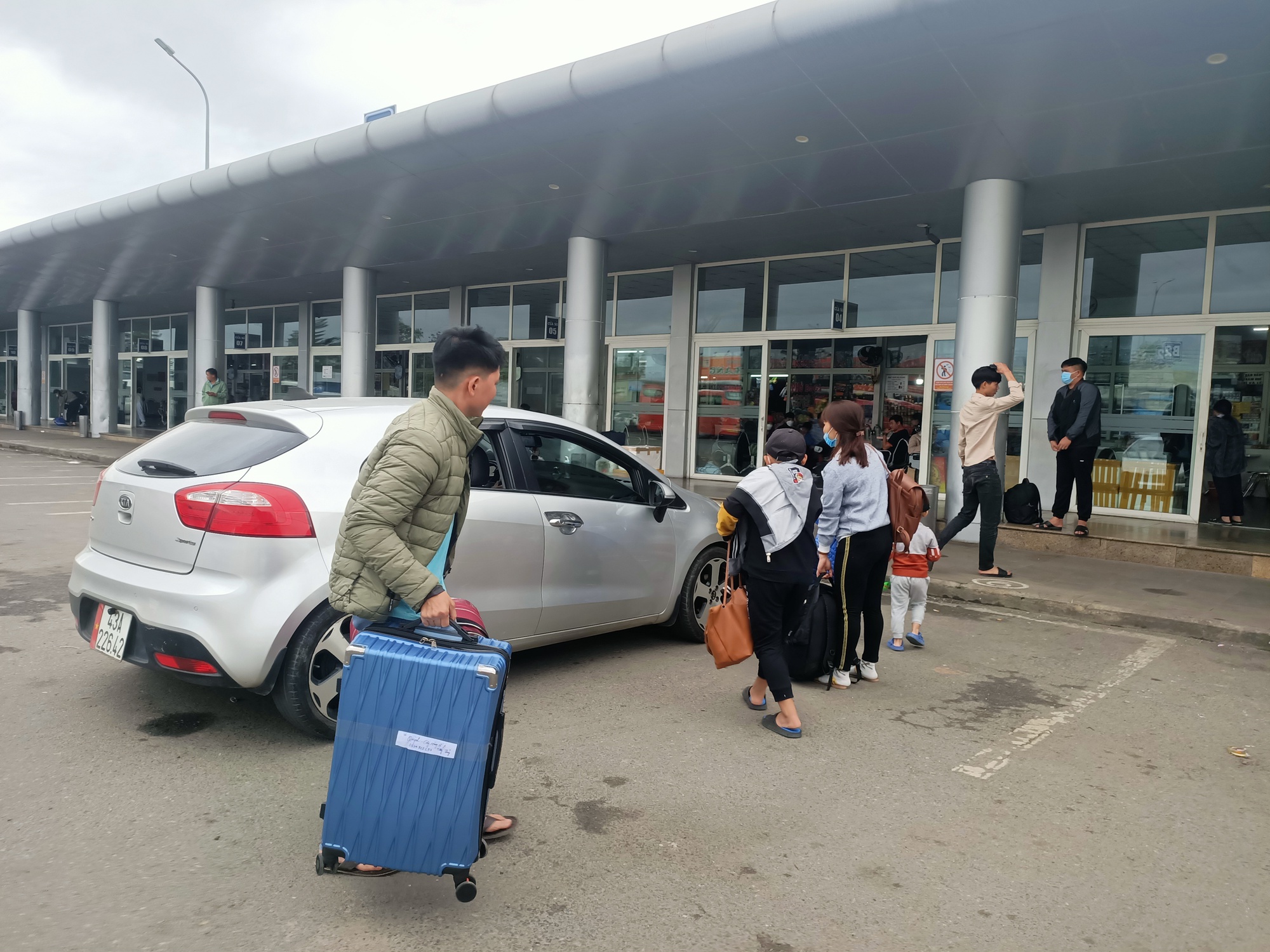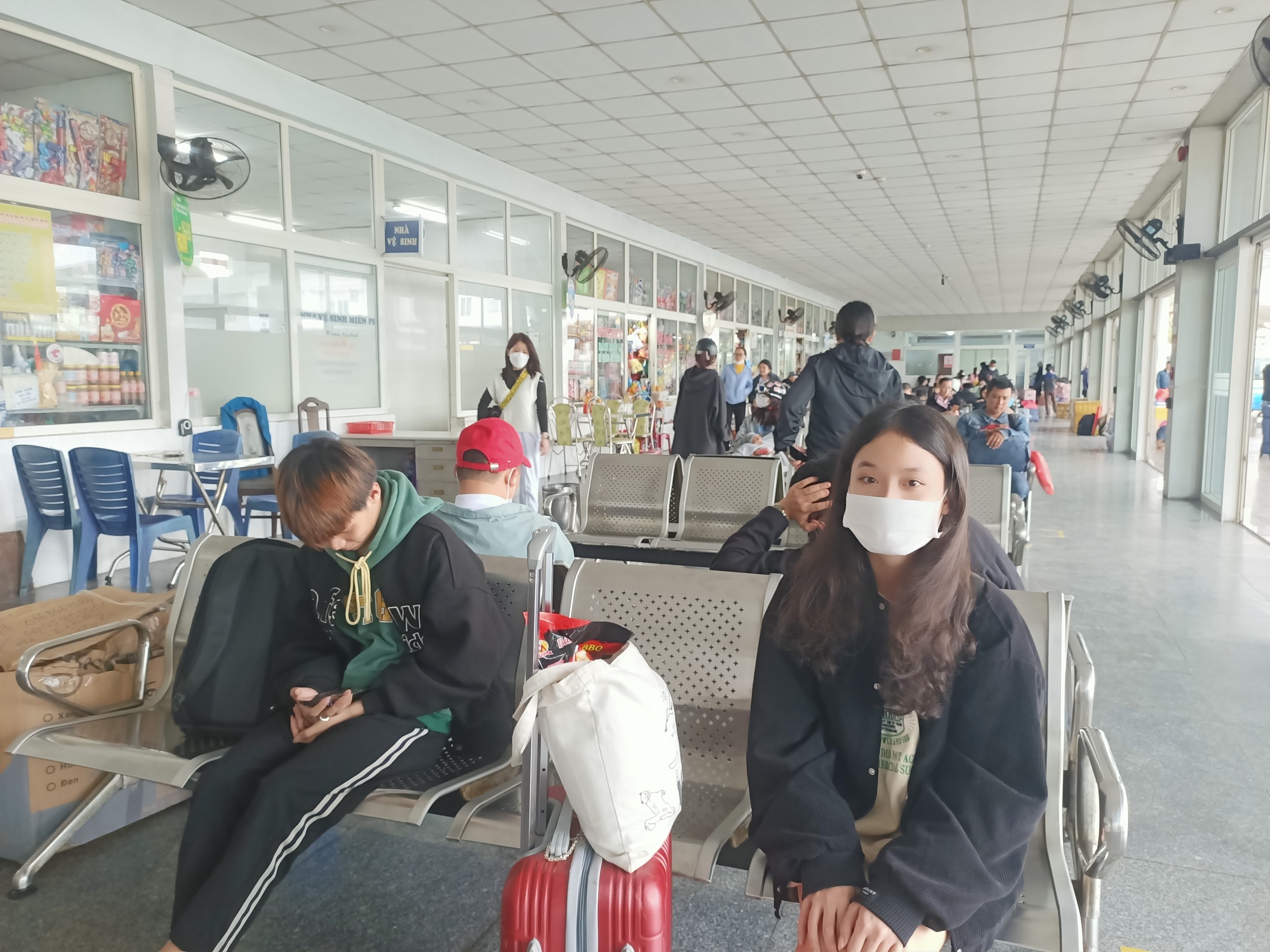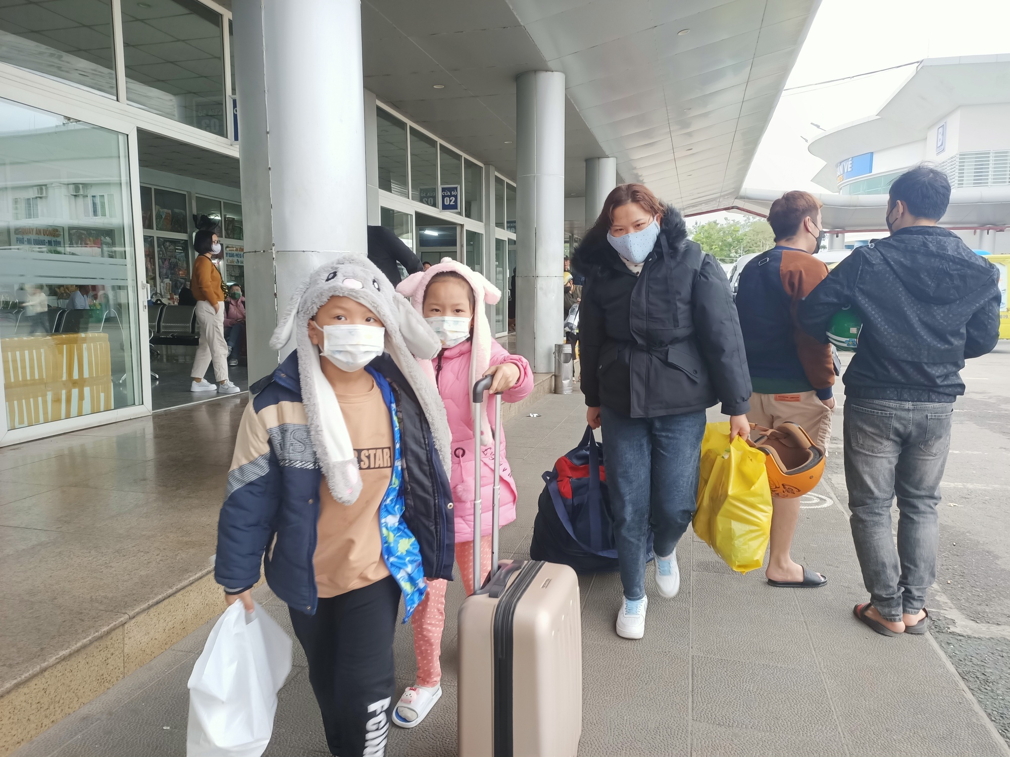 Một gia đình vừa xuống bến xe, vào nhà ga đón khách, chờ chuyến xe của mình về quê đón Tết