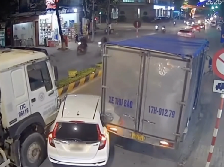 Theo đó, một chiếc xe tải chở thư báo dừng ở làn phải khiến các phương tiện phía sau buộc phải dạt dần sang làn trái để di chuyển. Lúc này, một ô tô con màu trắng đi ở đường bên phải đã phát hiện chiếc xe thư báo. Tuy nhiên, thay vì quan sát, giảm tốc độ để nhường đường cho xe đi ở làn trái, thì tài xế xe con bất ngờ chuyển làn gấp, tạt đầu xe đầu kéo đang lưu thông cùng chiều.