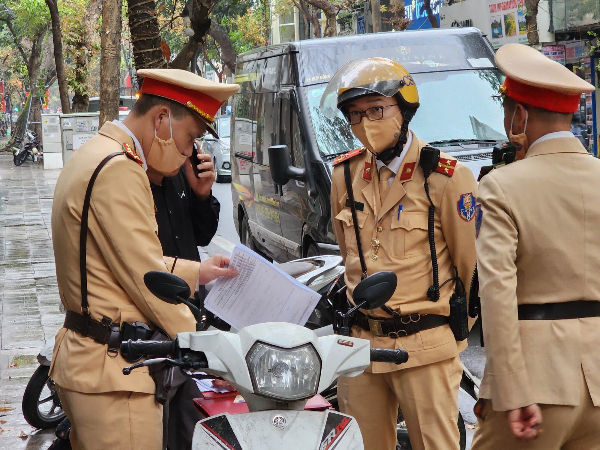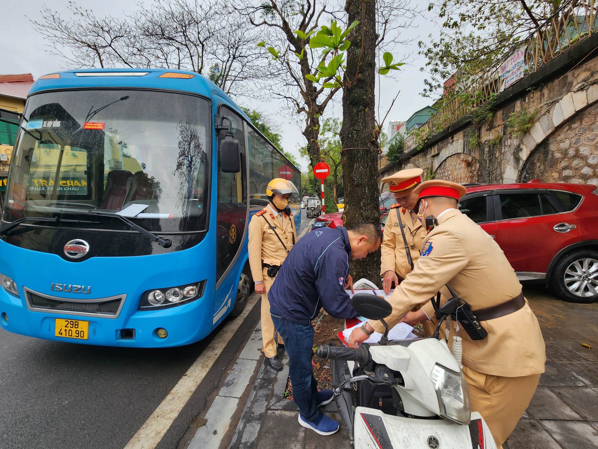 Lực lượng CSGT Hà Nội kiểm tra xe ô tô chở khách hợp đồng trên địa bàn quận Hoàn Kiếm.
