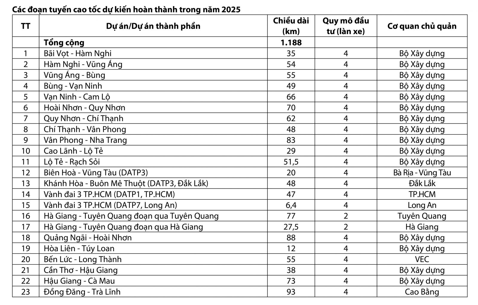 Cụ thể, ngay trong tháng 4/2025, nhân dịp kỷ niệm 50 năm Thống nhất đất nước, Bộ Xây dựng dự kiến hoàn thành đưa vào khai thác 2 đoạn cao tốc dài 90 km gồm: Bến Lức - Long Thành (20 km) và đoạn cuối dự án Vân Phong - Nha Trang (70 km); thông xe tuyến chính 4 dự án dài 158 km, gồm: Bãi Vọt - Hàm Nghi, Hàm Nghi - Vũng Áng, Bùng - Vạn Ninh và Biên Hòa - Vũng Tàu.