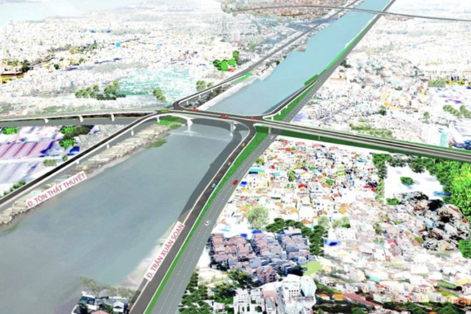 Phối cảnh cầu đường Nguyễn Khoái khi hoàn thành đưa vào sử dụng sẽ có các nhánh nối với đường Tôn Thất Thuyết, Trần Xuân Soạn.
