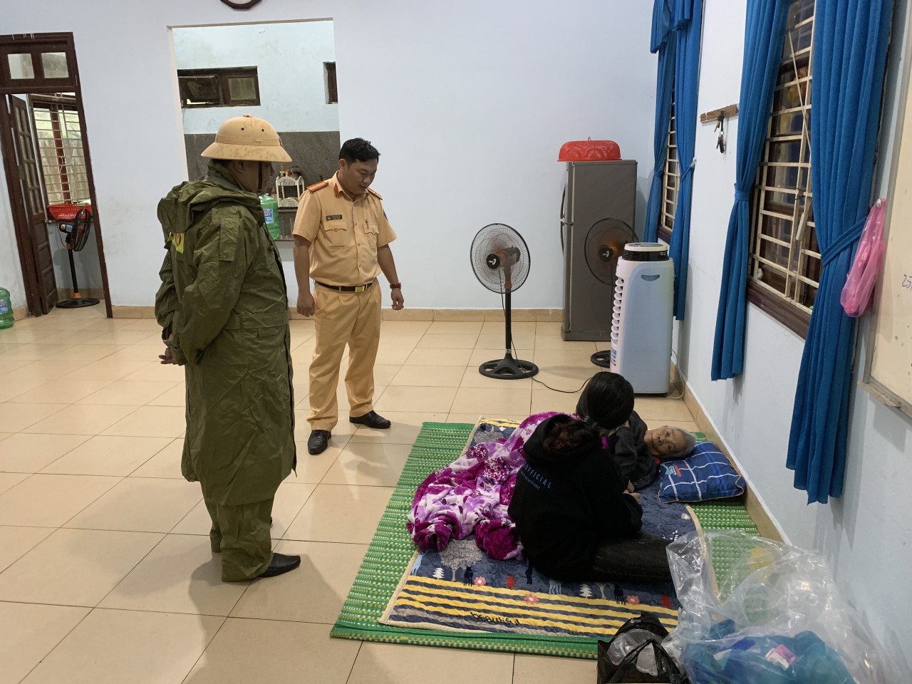 Cán bộ chiến sĩ giúp người dân sống ở ven biển tránh trú bão tại trạm CSGT