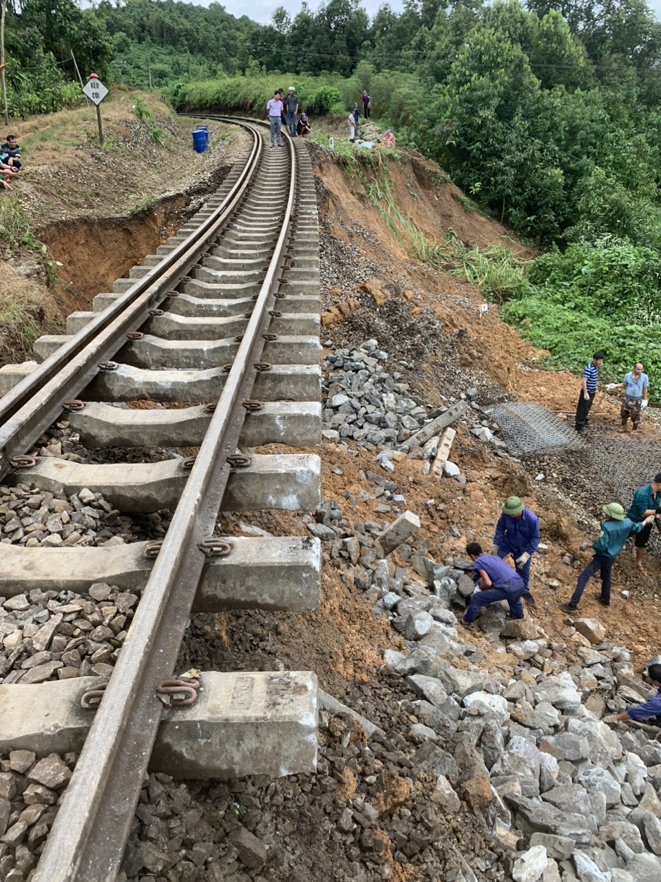 "Phải làm đường tạm, ổn định cho tàu lưu thông thì mới khắc phục được đường cũ đang hư hỏng. Hiện nay, công nhân của chúng tôi đang tập trung đắp đất, đá hộc để nâng nền đường lên bằng cao độ của đường cũ, đơn vị làm ba ca liên tục. Do cự ly từ điểm sạt lở đường đến nơi tiếp cận mỏ đá mất khoảng gần 40km, địa hình hiểm trở, đường độc đạo, vận chuyển hoàn toàn bằng thủ công nên chúng tôi gặp vô vàn khó khăn", ông Cường chia sẻ thêm.
