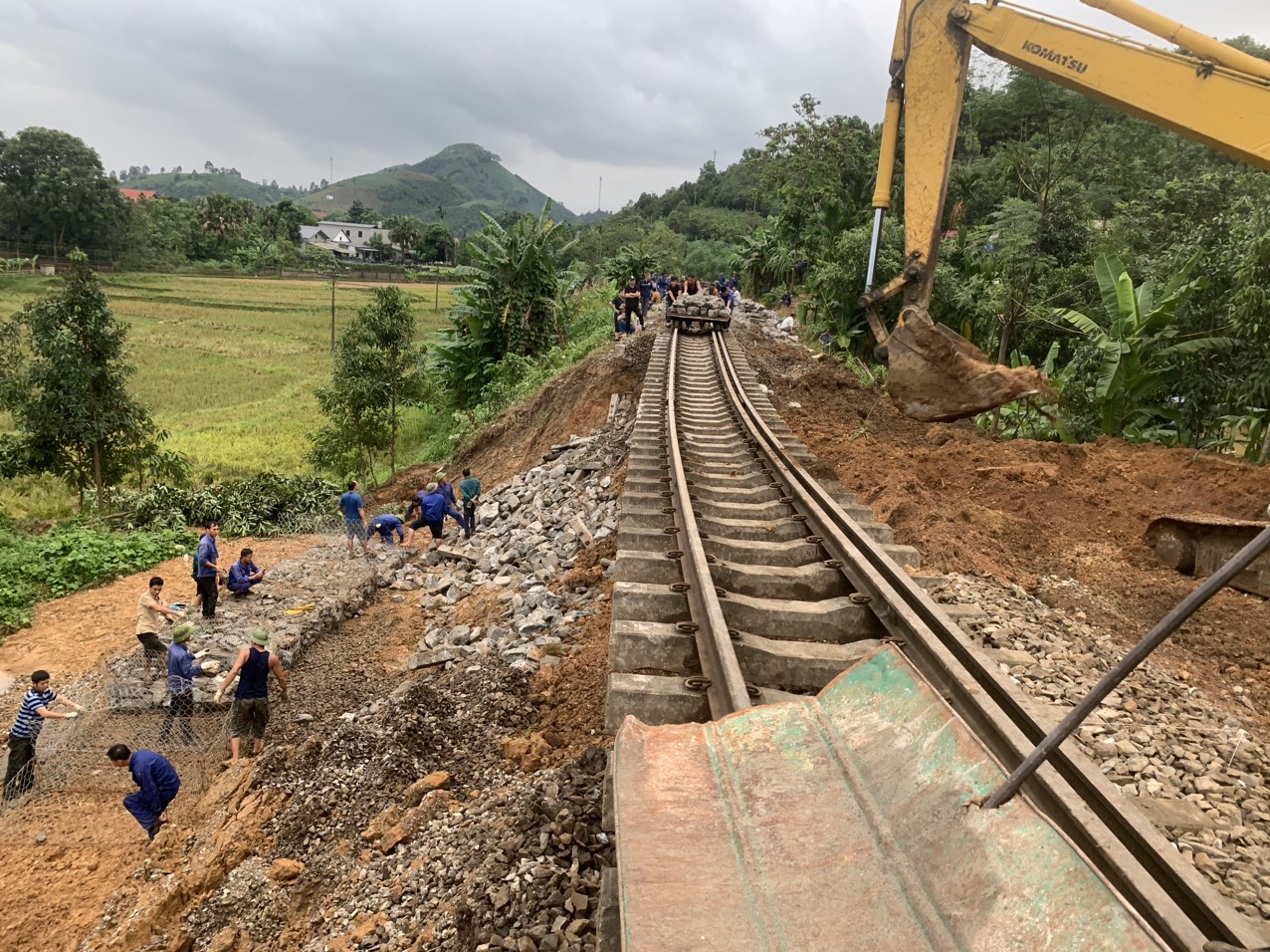Công ty Cổ phần Đường sắt Yên Lào huy động toàn bộ lực lượng CBCNV cùng máy móc, phương tiện làm xuyên đêm để sớm khôi phục lại tuyến đường sắt Hà Nội - Lào Cai
