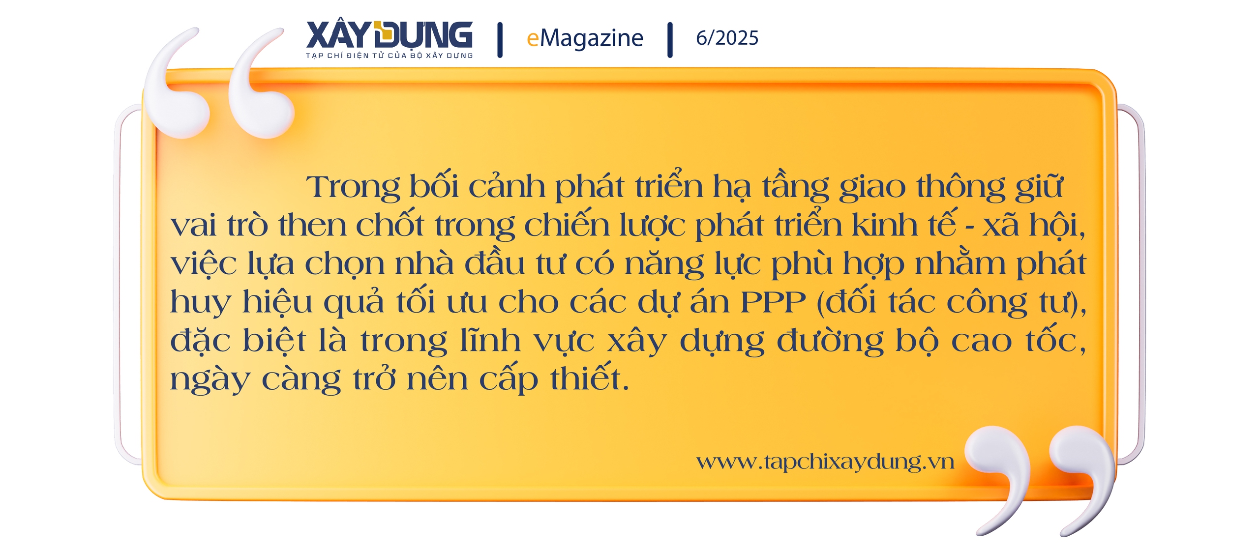 Việc lựa chọn nhà đầu tư trong các dự án PPP xây dựng đường bộ cao tốc không chỉ là bước then chốt bảo đảm thành công của dự án, mà còn phản ánh hiệu quả trong công tác quản lý và sử dụng nguồn lực xã hội. Các tiêu chí lựa chọn nhà đầu tư cần được xây dựng trên cơ sở vừa tuân thủ quy định pháp luật, vừa đảm bảo tính minh bạch, cạnh tranh và phù hợp với đặc thù từng dự án.
