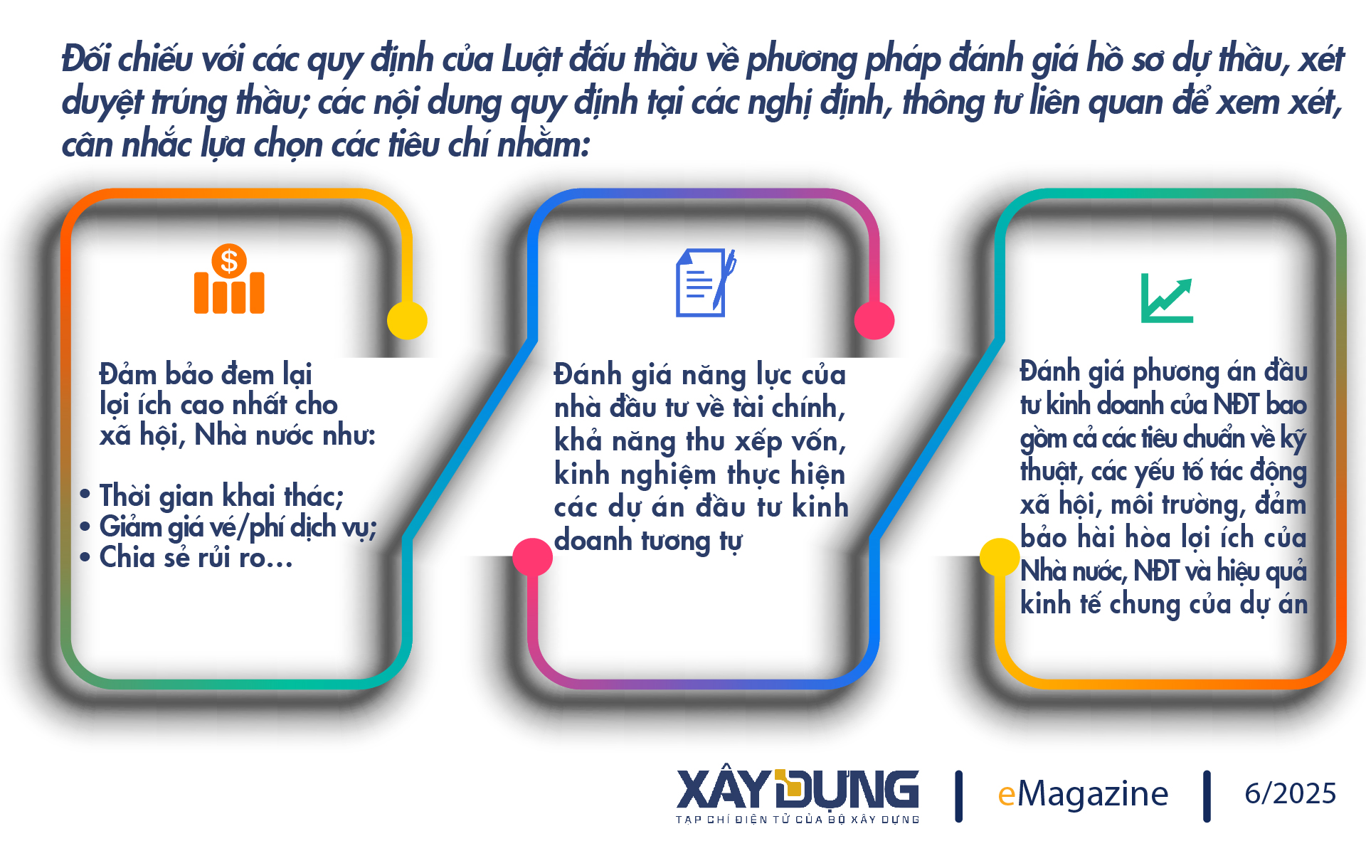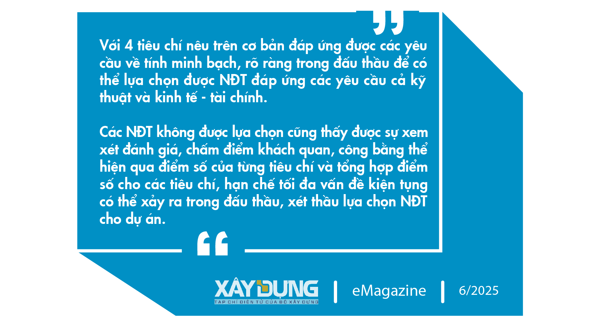 Các mục tiêu của dự án, thông tin trong hồ sơ mời thầu và các tiêu chí đánh giá cần đảm bảo tính nhất quán. Quyết định lựa chọn NĐT thực hiện là kết quả của các đánh giá dựa trên cơ sở tiêu chí đạt/không đạt hoặc trên thang điểm hay kết hợp giữa các tiêu chí đánh giá đạt /không đạt và thang điểm quy định.