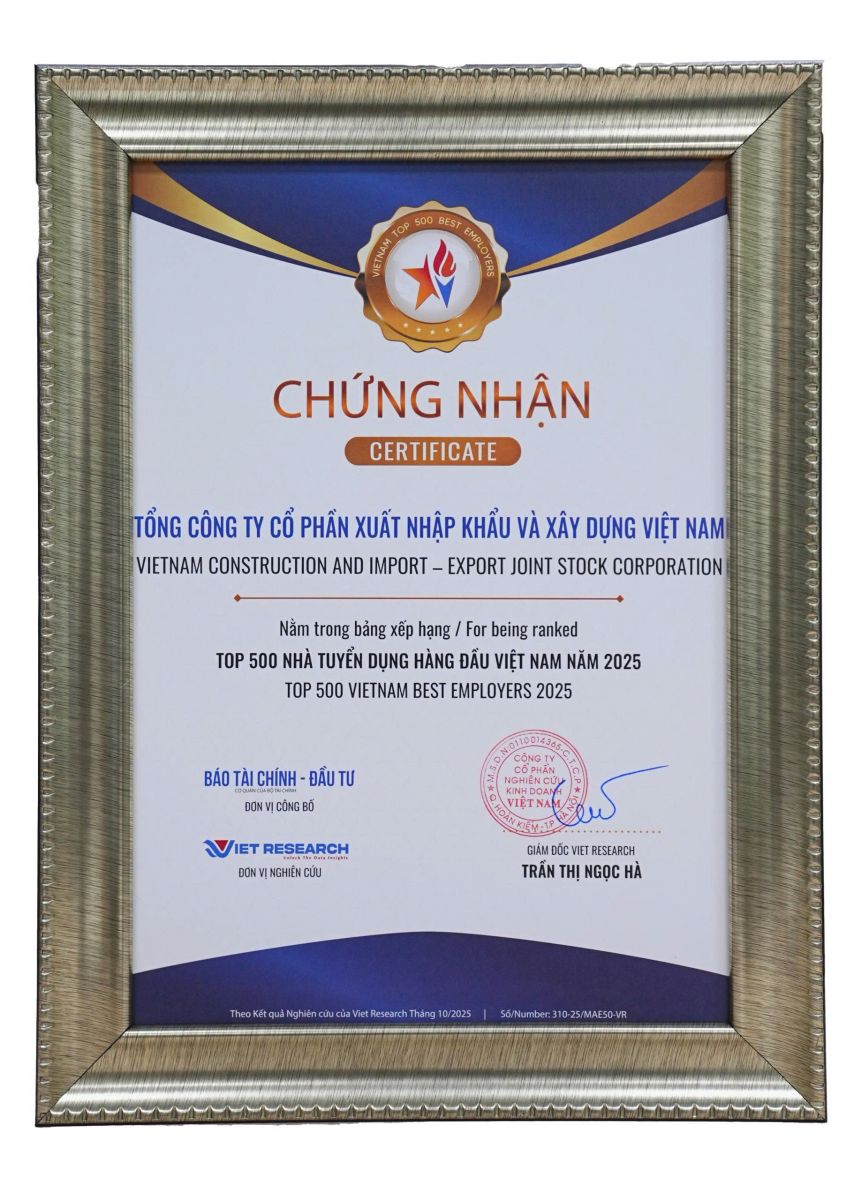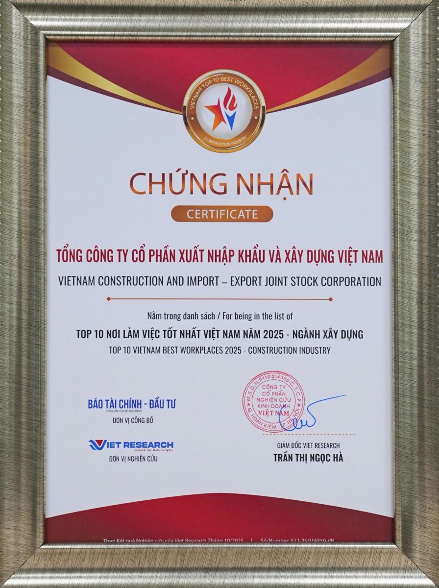 Đây là năm thứ 3 liên tiếp VINACONEX được vinh danh tại vị trí thứ 2 trong TOP 10 Nơi làm việc tốt nhất Việt Nam 2025 – Ngành Xây dựng. Thành tích này là sự ghi nhận cho những nỗ lực bền bỉ của VINACONEX, đơn vị TOP 2 nhà thầu xây dựng Việt Nam trên hành trình không ngừng kiến tạo giá trị vững bền, đặt con người ở vị trí trung tâm và đóng góp tích cực vì sự phát triển chung.