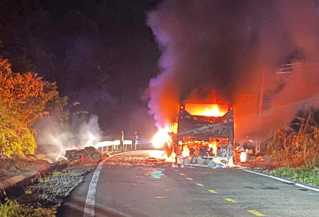 Hiện trường xe khách bốc cháy dữ dội tại đèo Khánh Lê tuyến QL27C