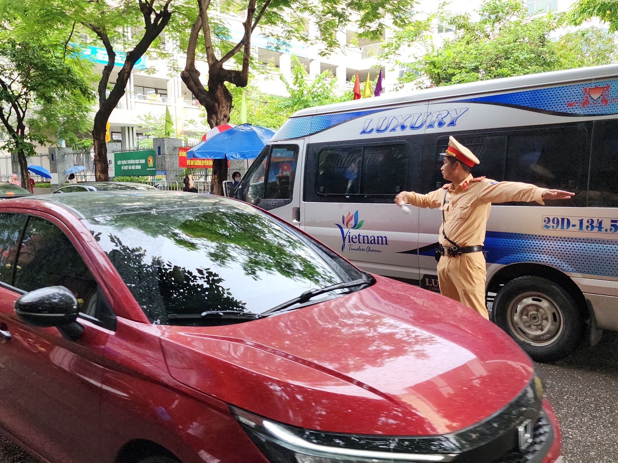 Lực lượng CSGT Công an TP Hà Nội phân luồng giao thông, giúp thí sinh qua đường, cũng như phát nước miễn phí thí sinh tại điểm thi trên địa bàn