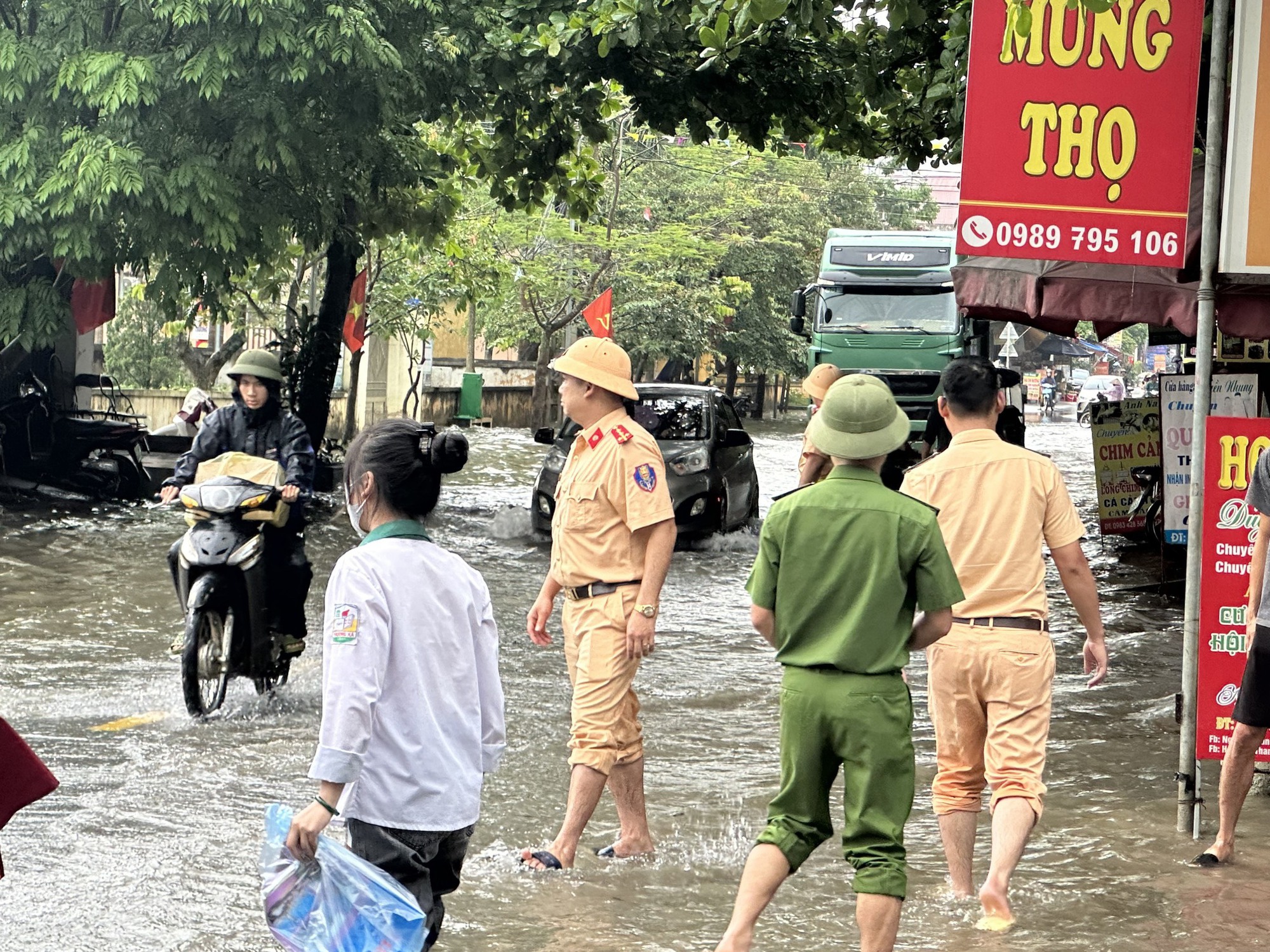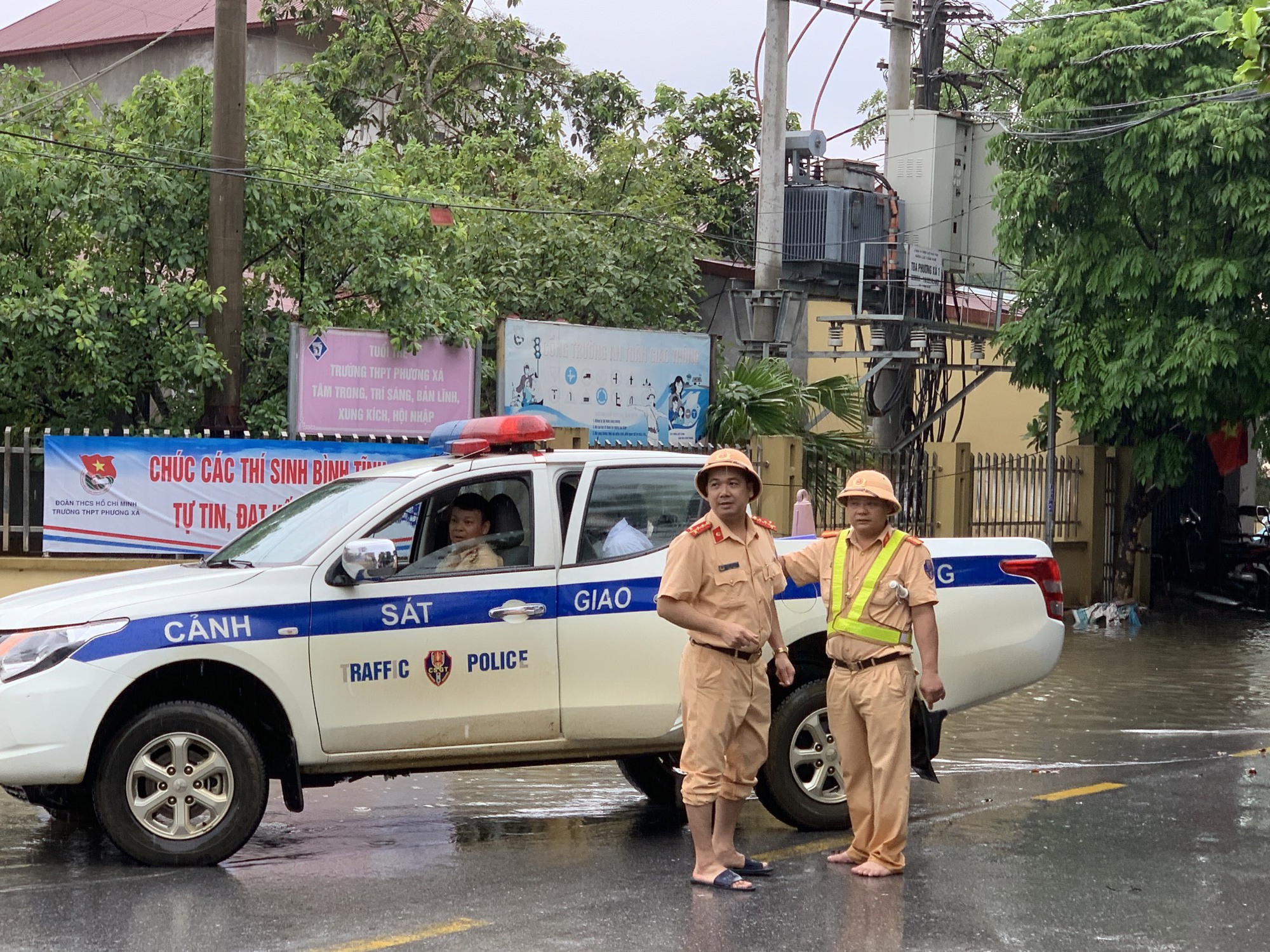 Lực lượng CSGT tỉnh Phú Thọ dùng xe chuyên dụng đưa nhiều thí sinh qua các điểm ngập nước do mưa lớn trên địa bàn