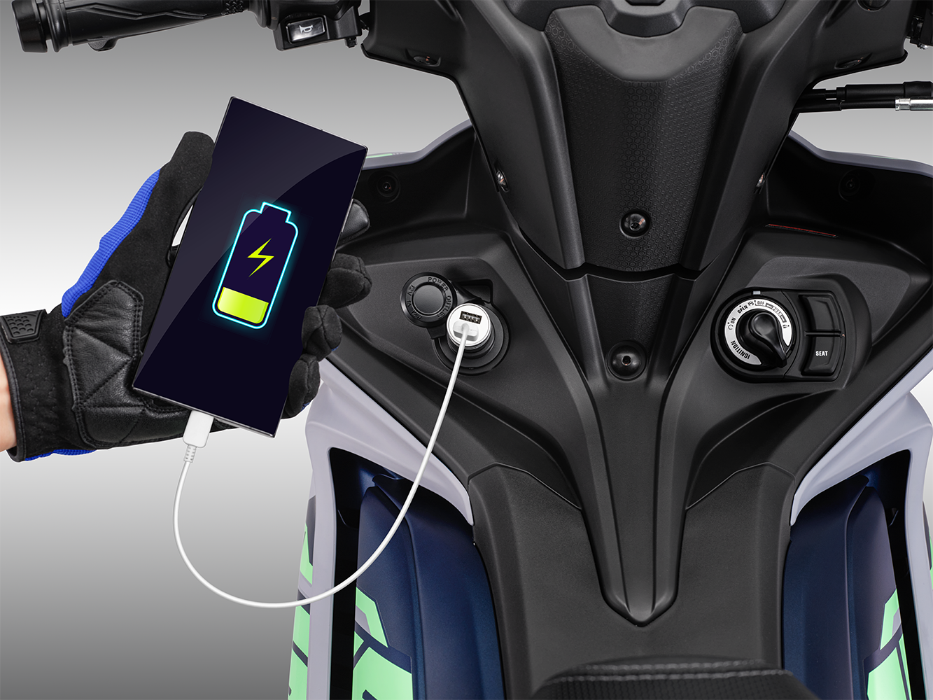 Khoá Smartkey, núm xoay khởi động, cổng sạc 12V là một trong những tíiện ích được duy trì trên phiên bản Exciter 155 VVA-ABS.