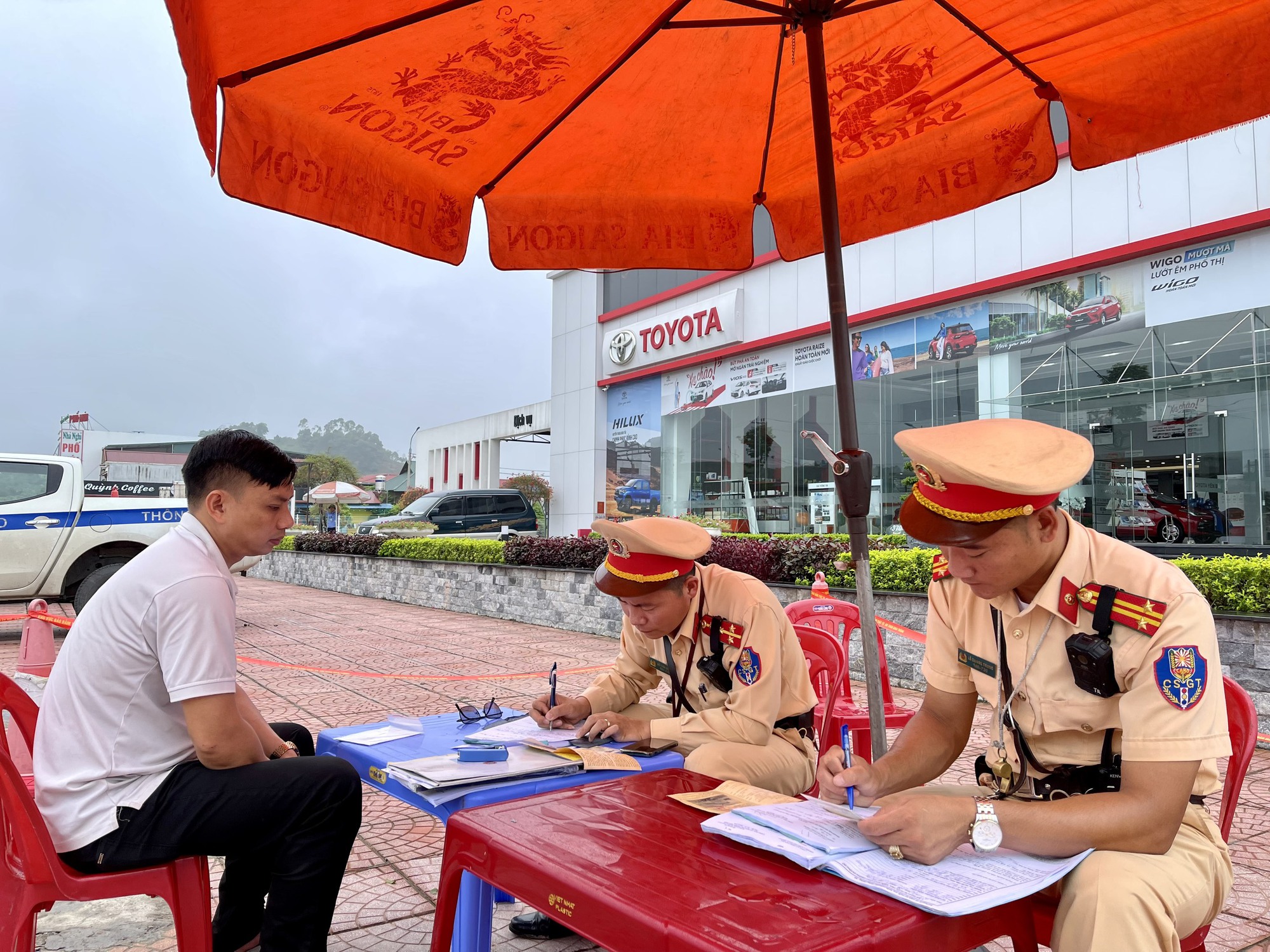 Một số hình ảnh tổ công tác Đội CSGT đường bộ số 1 (Yên Bái) phối hợp với các gara ô tô tổ chức tuyên truyền cho lái xe lưu thông trên quốc lộ về "Tổ hỗ trợ và khắc phục sự cố bảo đảm TTATGT"